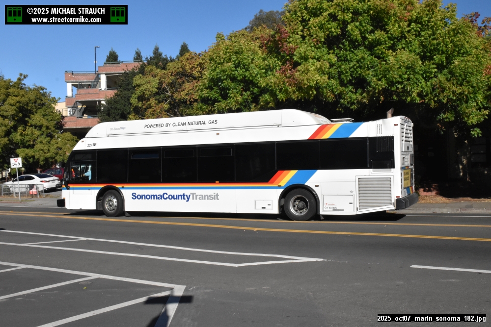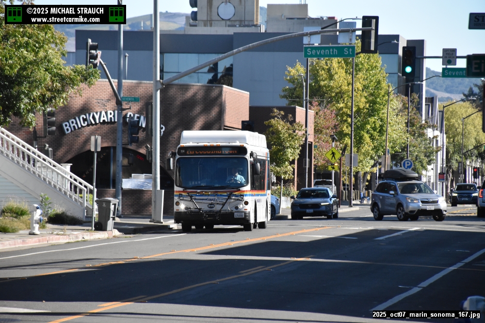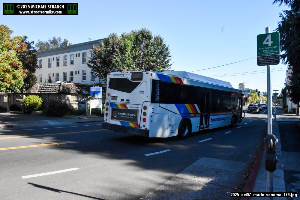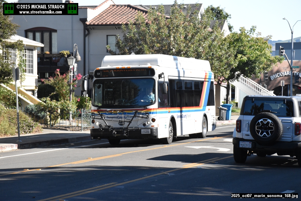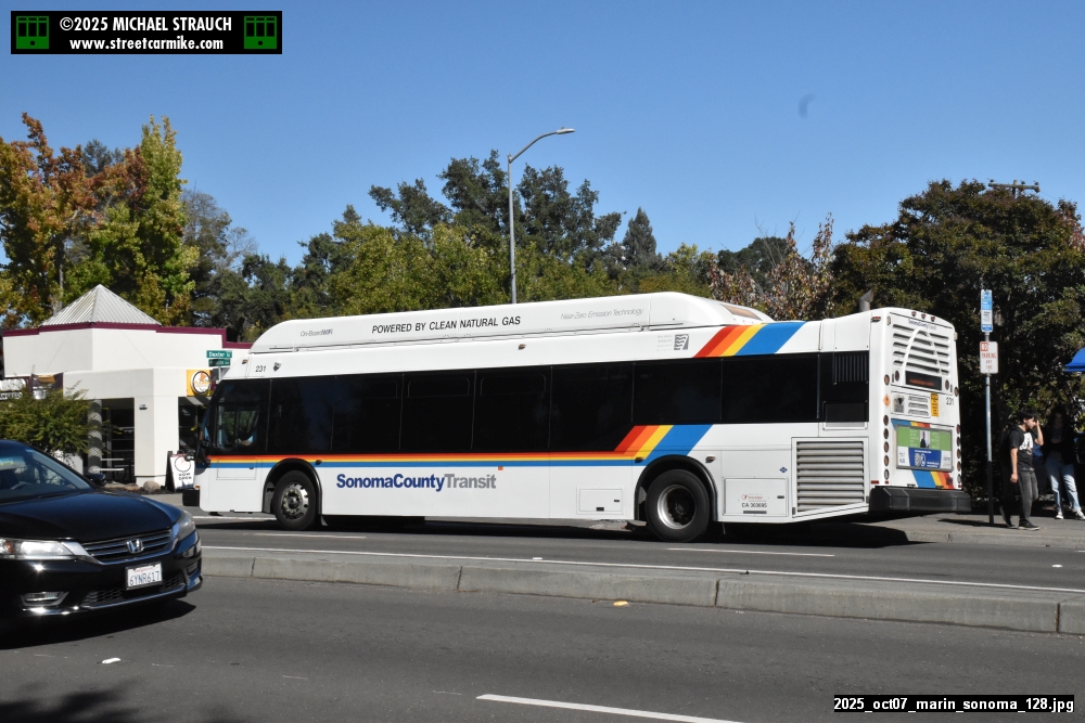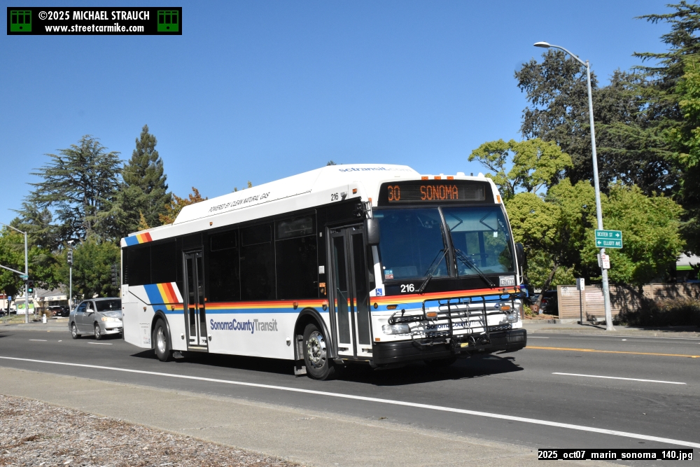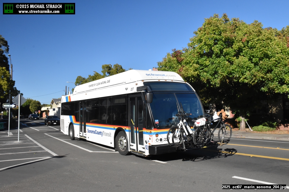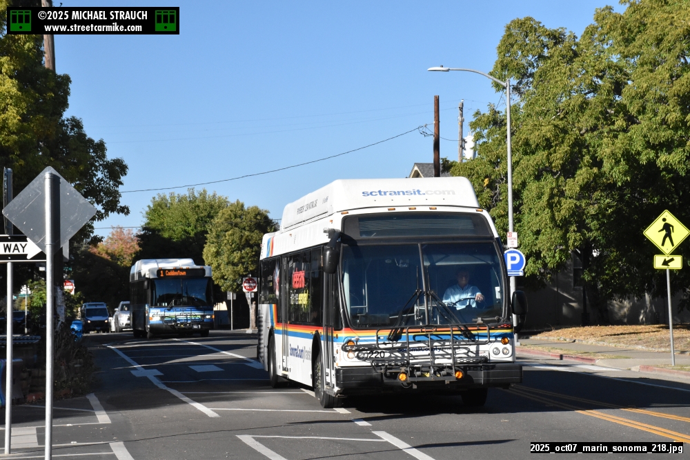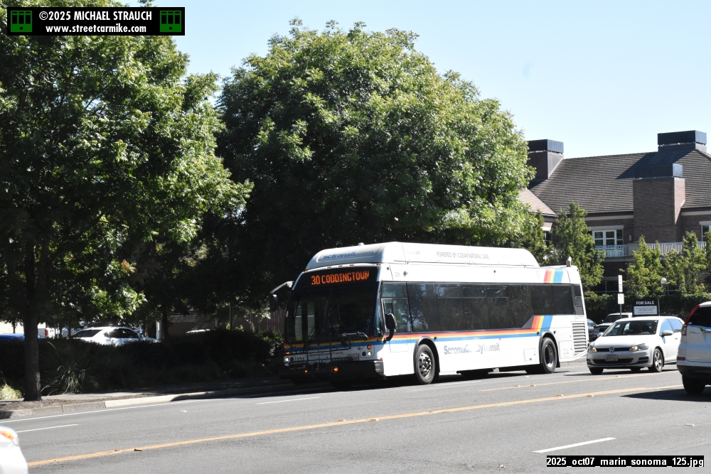 A drive up to Sonoma County begins with a stop in Marin City near the transit hub for Marin Transit and Golden Gate Transit buses. Then it's on to Petaluma, where I photographed a southbound SMART train behind the Lucky Supermarket on Petaluma Blvd. Drove on up to Santa Rosa and parked near Junior College to get pictures of buses on Mendocino Blvd., both Santa Rosa CityBus and Sonoma County Transit.