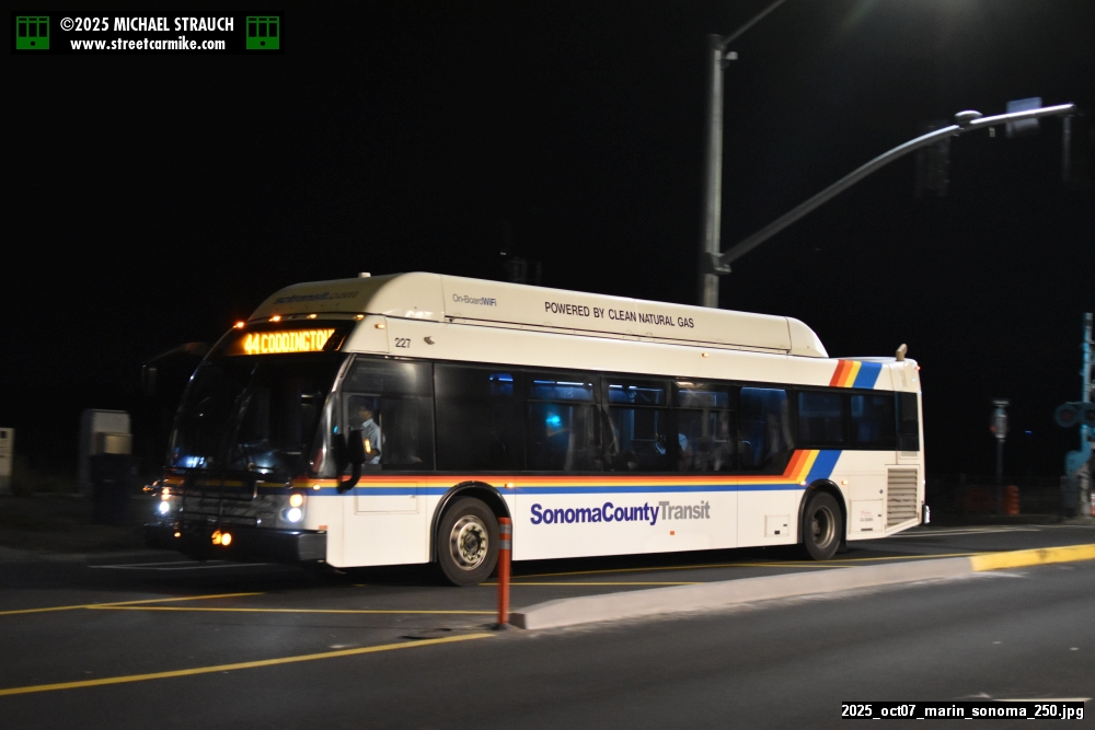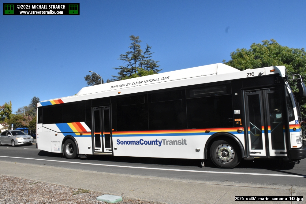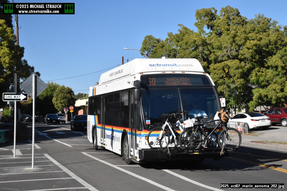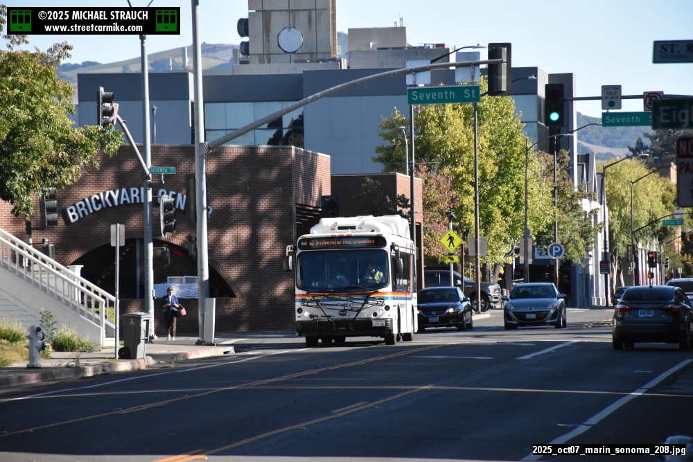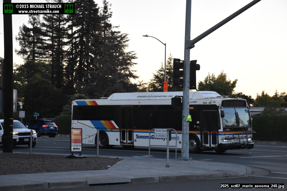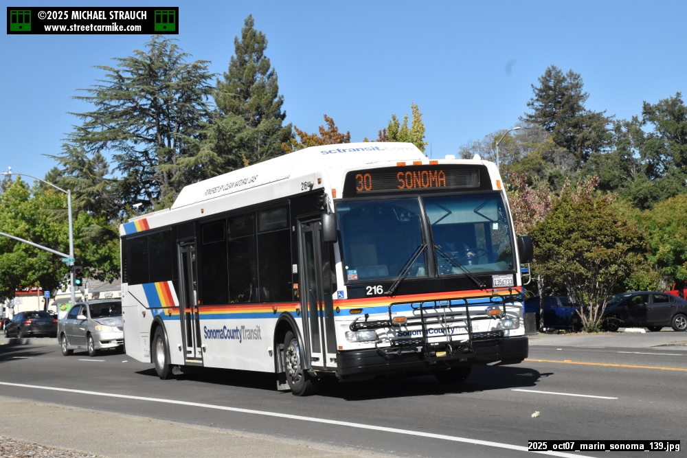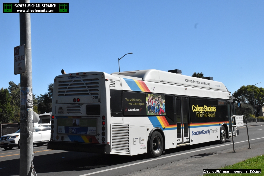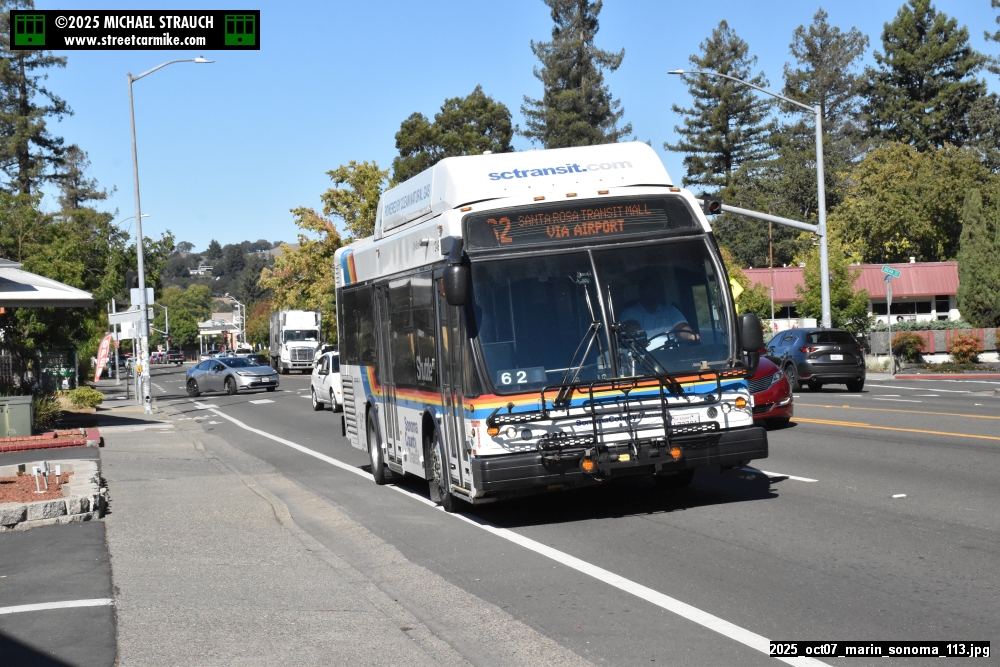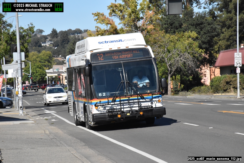 A drive up to Sonoma County begins with a stop in Marin City near the transit hub for Marin Transit and Golden Gate Transit buses. Then it's on to Petaluma, where I photographed a southbound SMART train behind the Lucky Supermarket on Petaluma Blvd. Drove on up to Santa Rosa and parked near Junior College to get pictures of buses on Mendocino Blvd., both Santa Rosa CityBus and Sonoma County Transit.