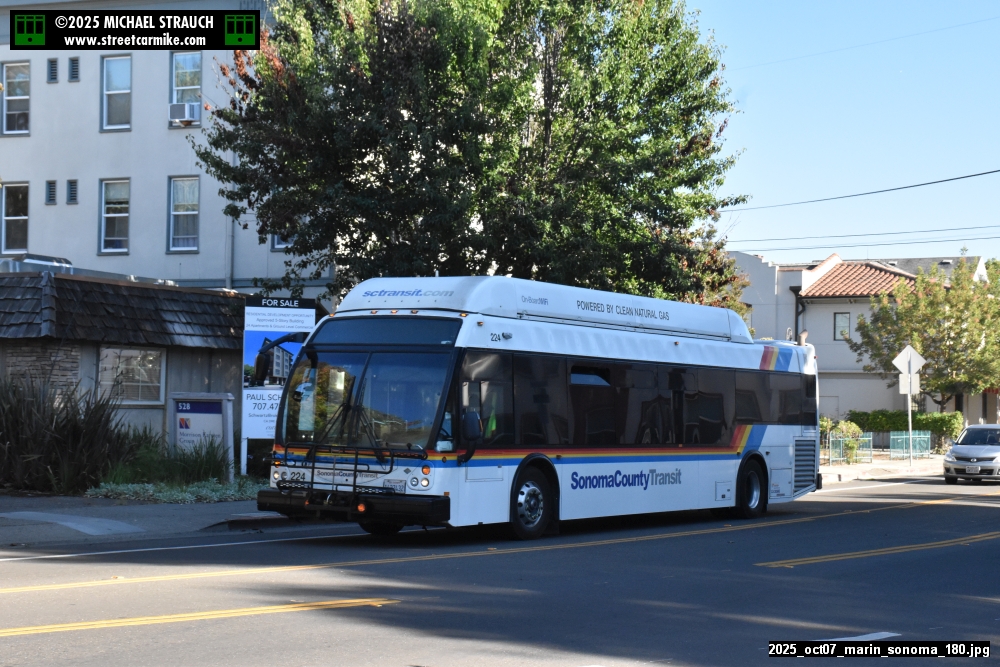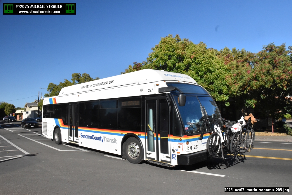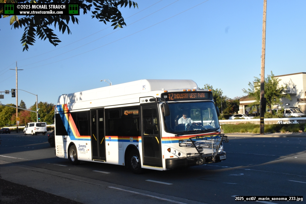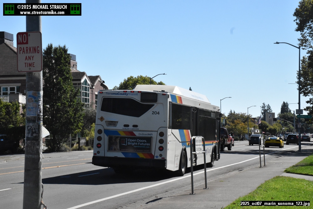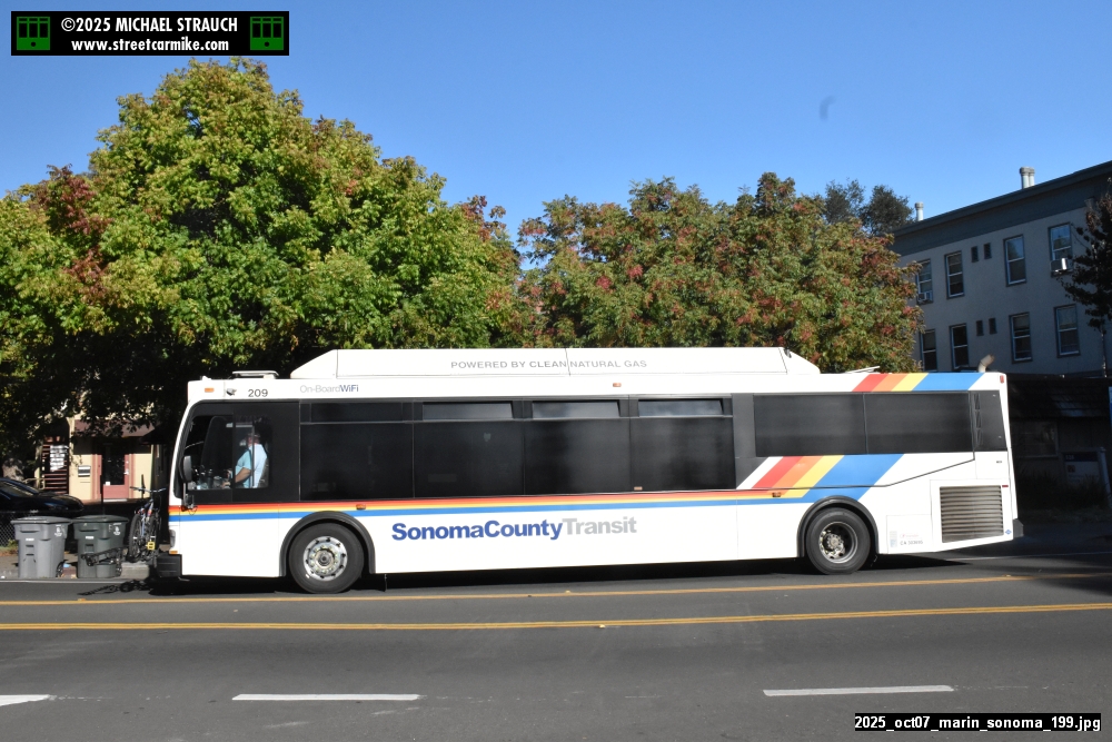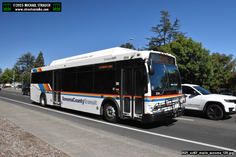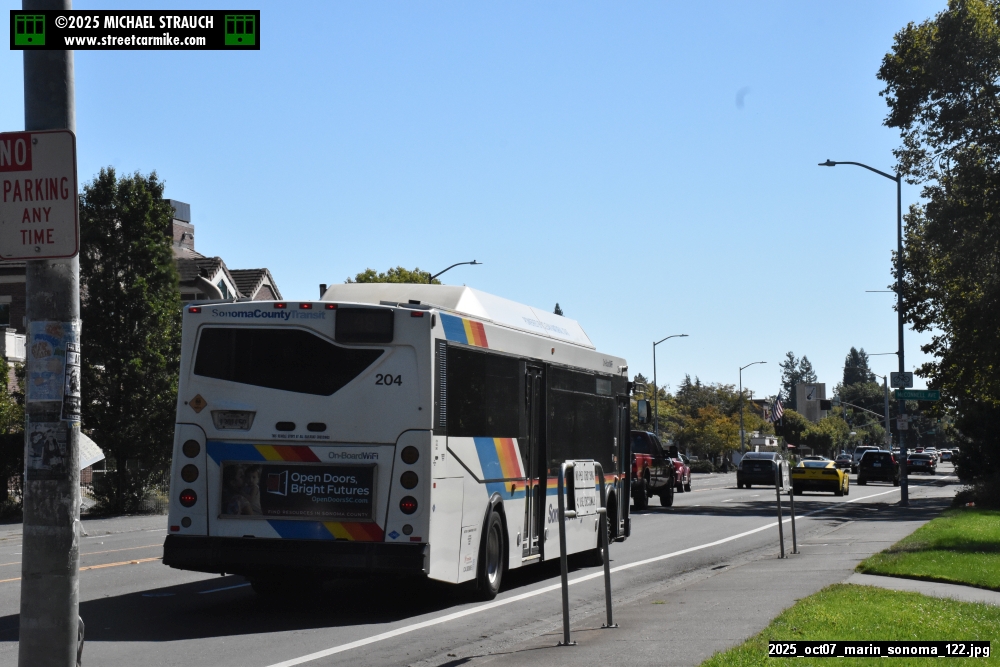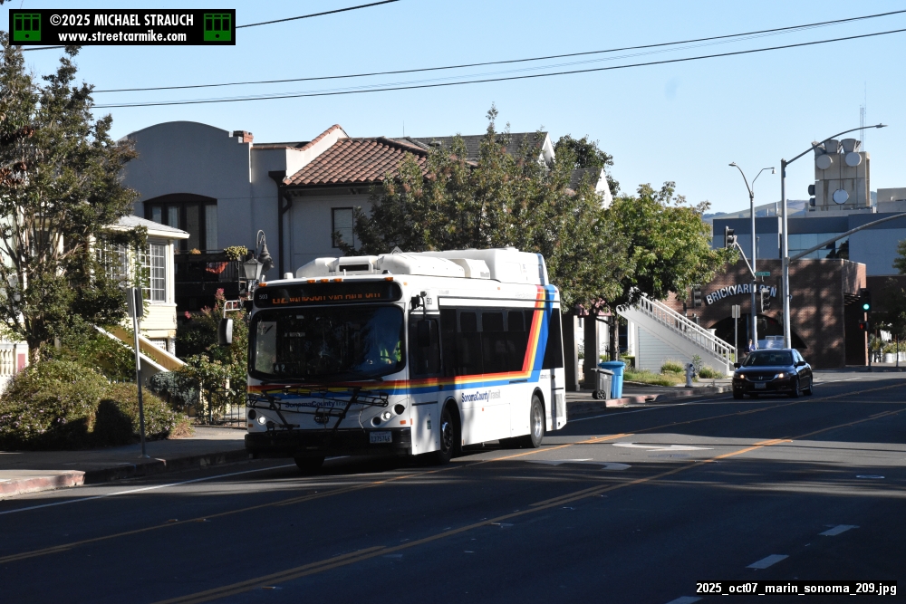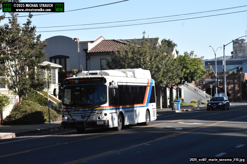 A drive up to Sonoma County begins with a stop in Marin City near the transit hub for Marin Transit and Golden Gate Transit buses. Then it's on to Petaluma, where I photographed a southbound SMART train behind the Lucky Supermarket on Petaluma Blvd. Drove on up to Santa Rosa and parked near Junior College to get pictures of buses on Mendocino Blvd., both Santa Rosa CityBus and Sonoma County Transit.