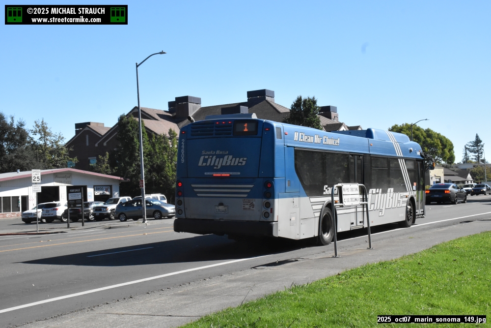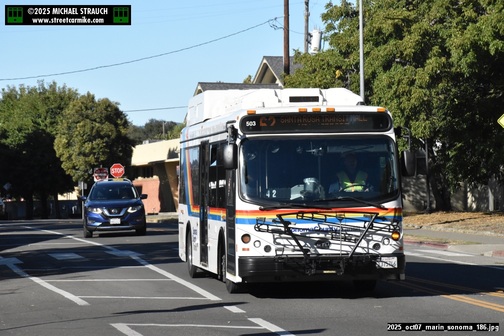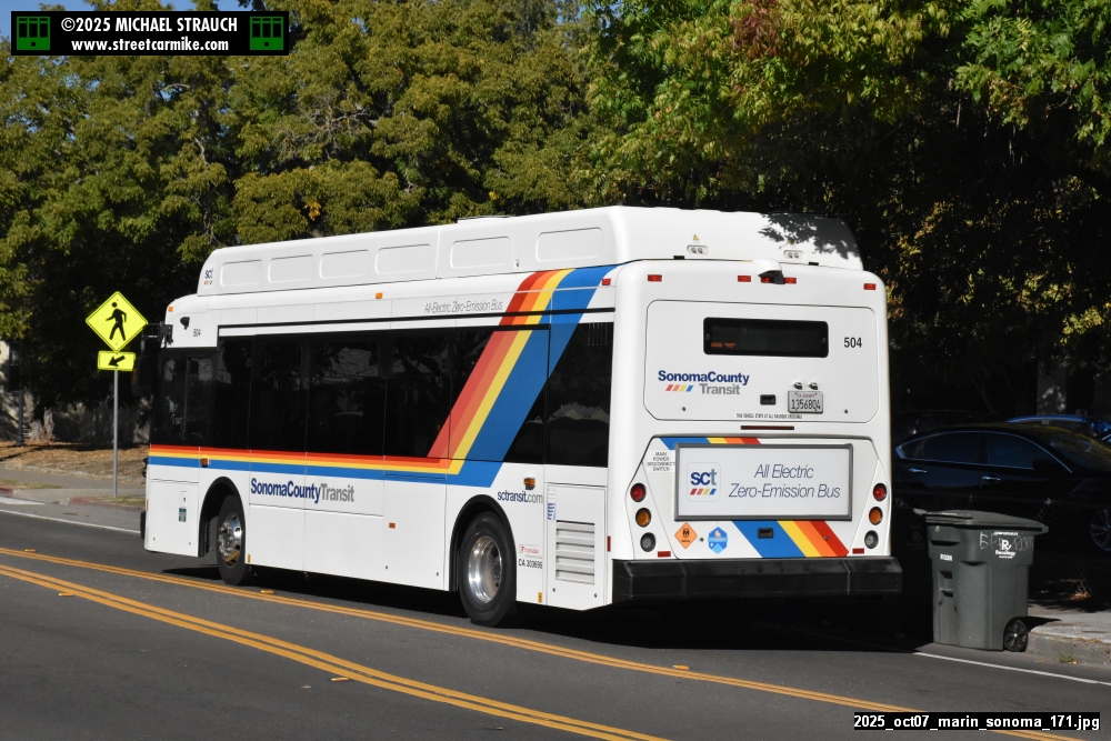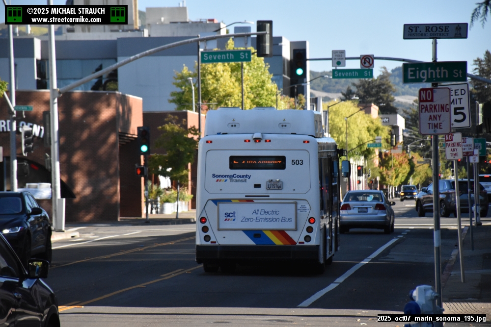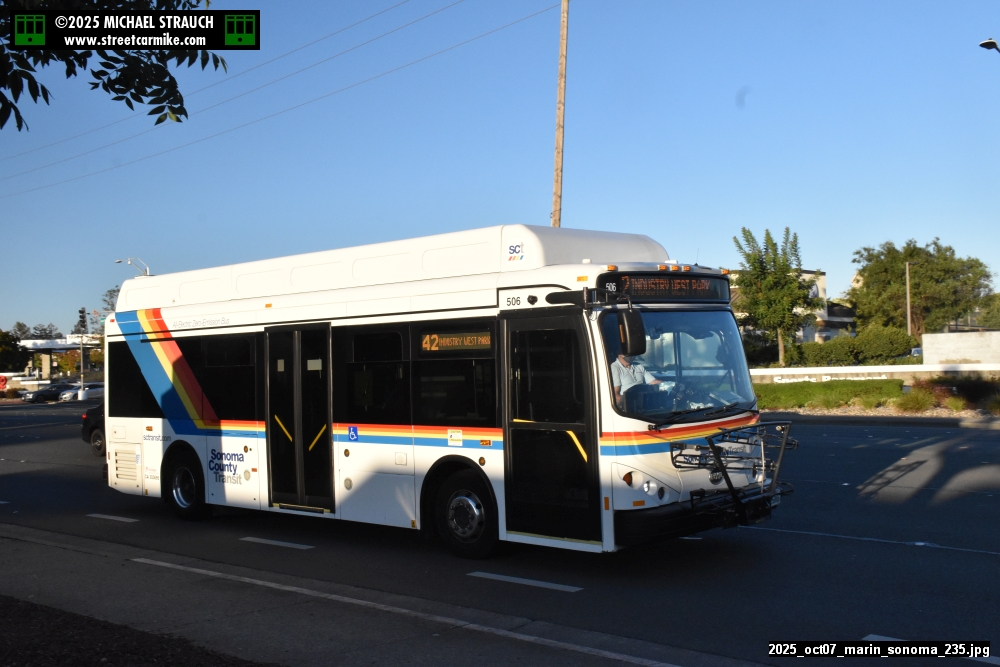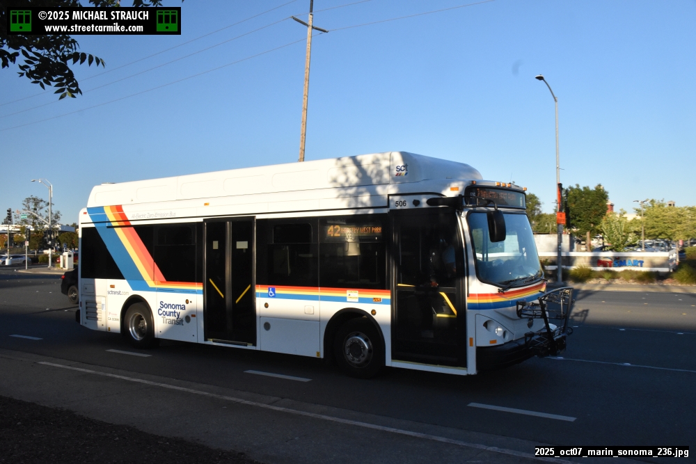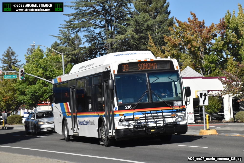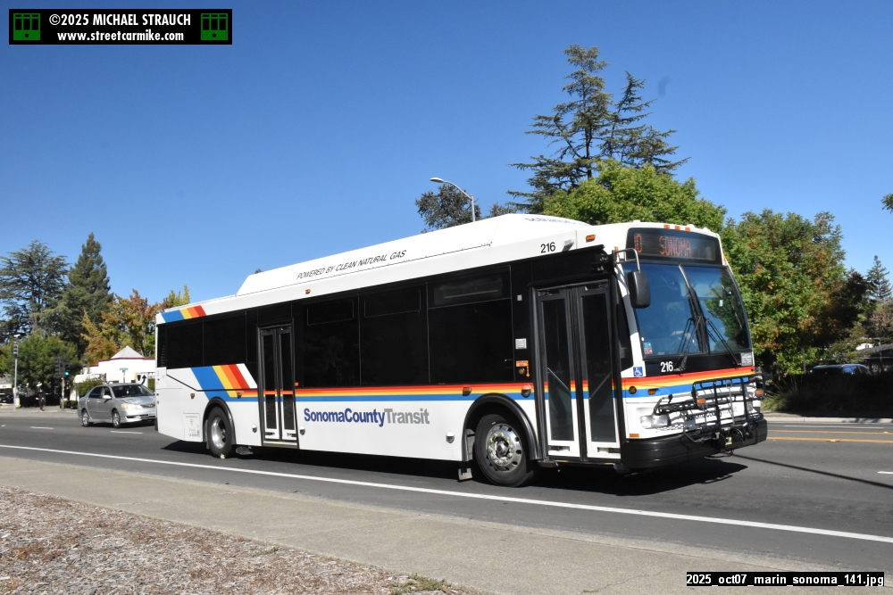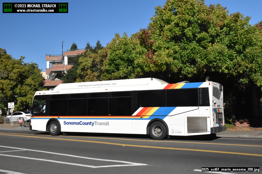 A drive up to Sonoma County begins with a stop in Marin City near the transit hub for Marin Transit and Golden Gate Transit buses. Then it's on to Petaluma, where I photographed a southbound SMART train behind the Lucky Supermarket on Petaluma Blvd. Drove on up to Santa Rosa and parked near Junior College to get pictures of buses on Mendocino Blvd., both Santa Rosa CityBus and Sonoma County Transit.