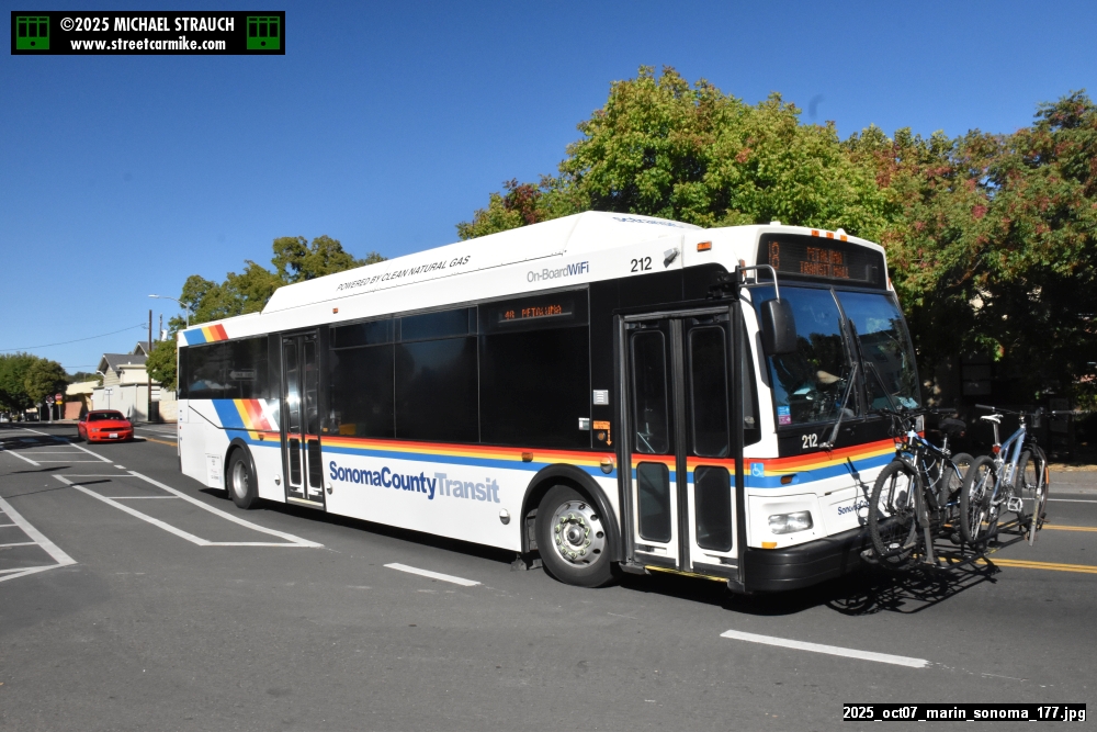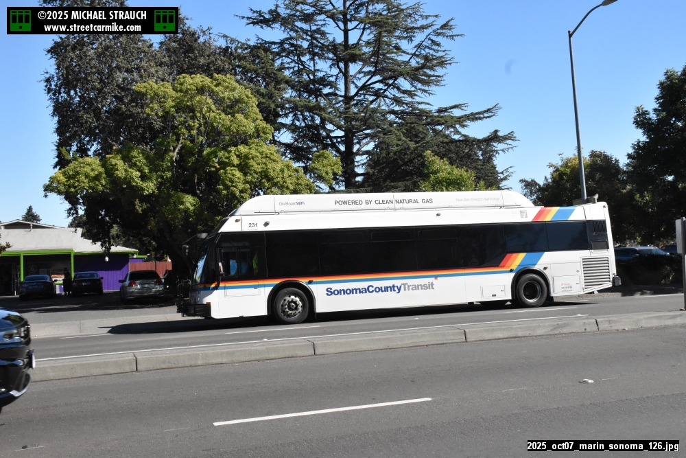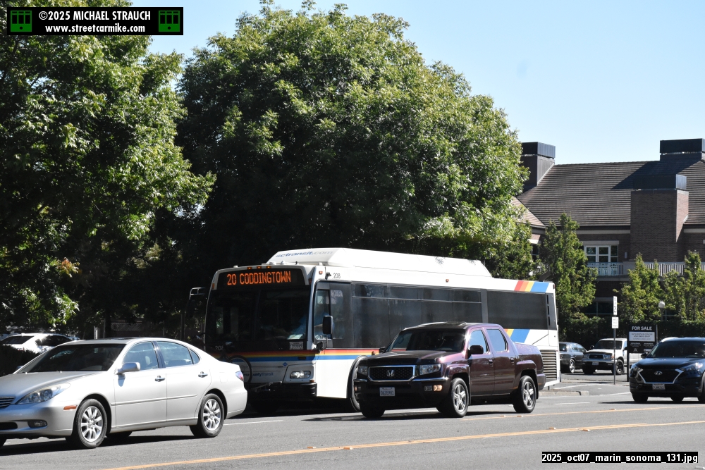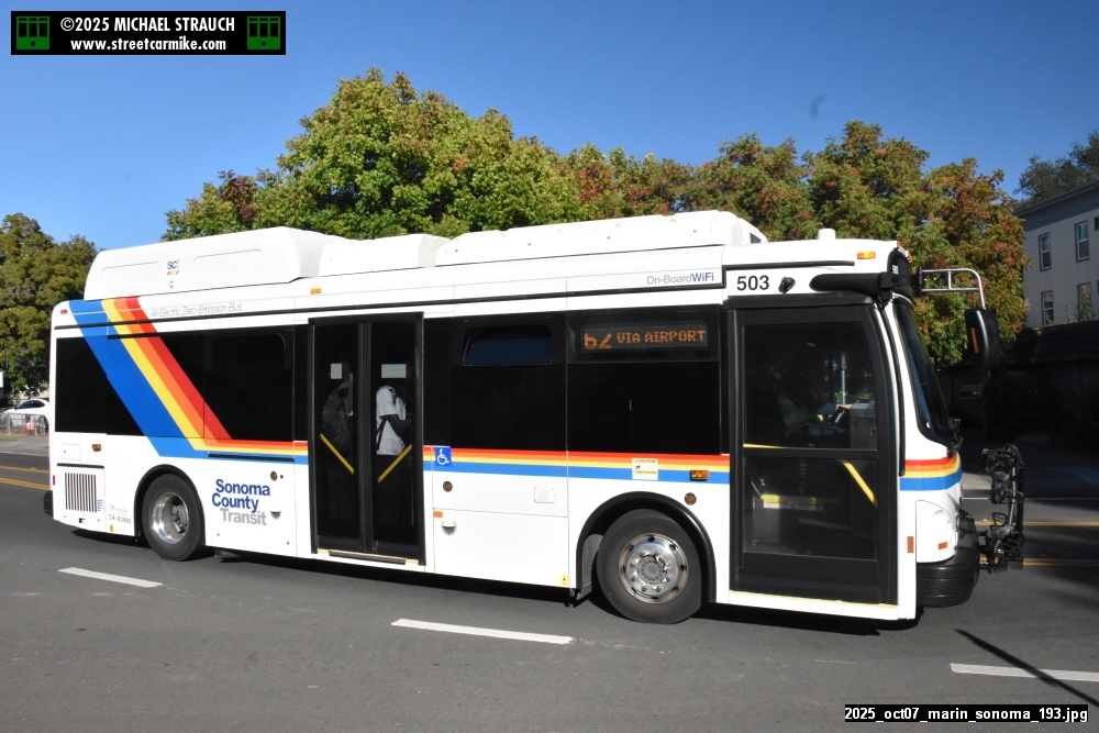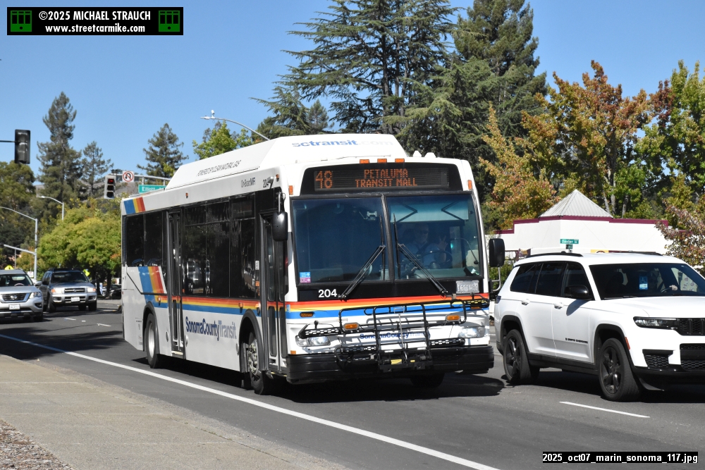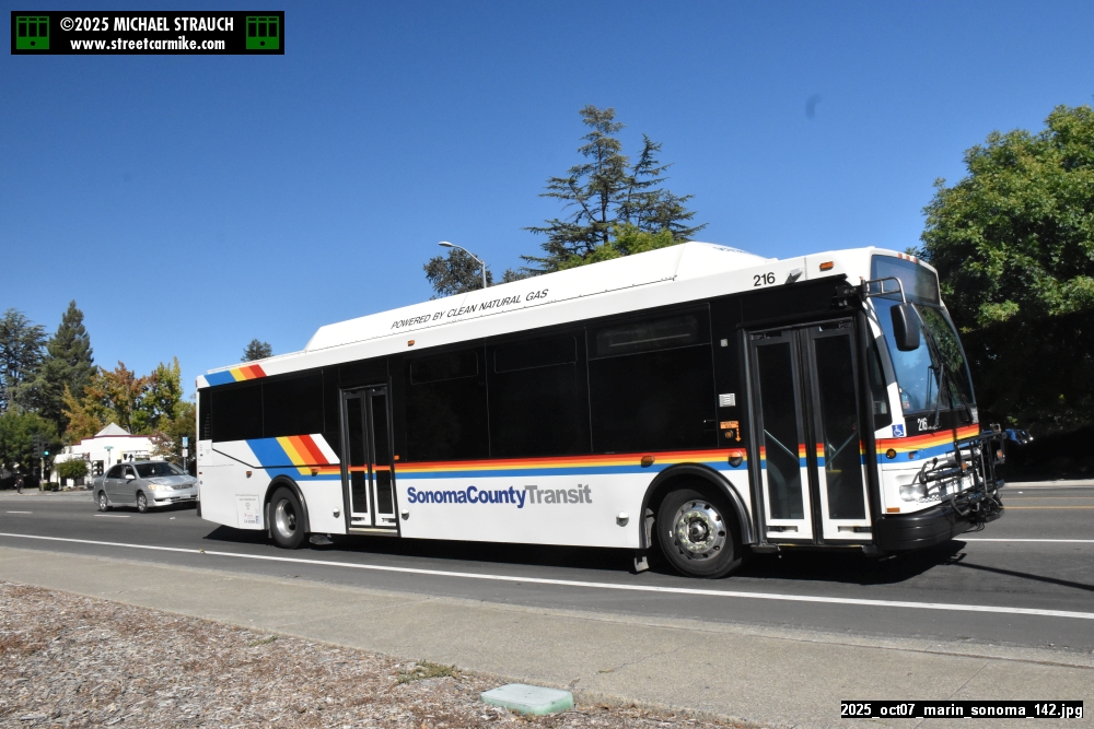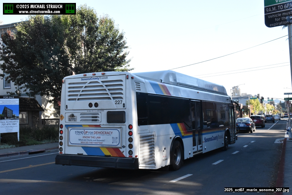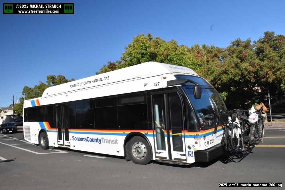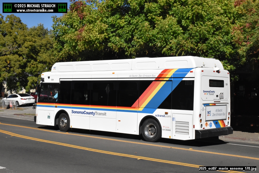 A drive up to Sonoma County begins with a stop in Marin City near the transit hub for Marin Transit and Golden Gate Transit buses. Then it's on to Petaluma, where I photographed a southbound SMART train behind the Lucky Supermarket on Petaluma Blvd. Drove on up to Santa Rosa and parked near Junior College to get pictures of buses on Mendocino Blvd., both Santa Rosa CityBus and Sonoma County Transit.