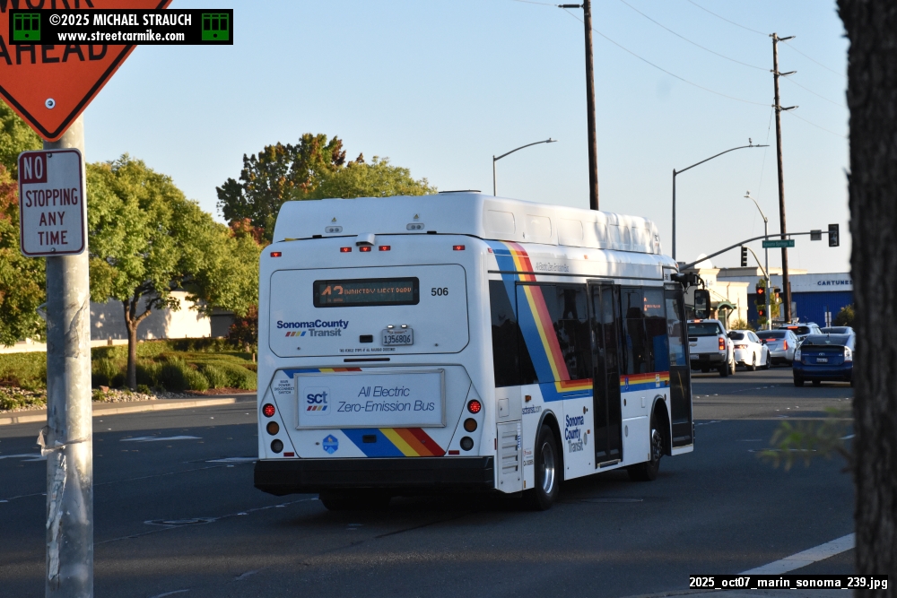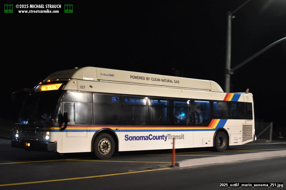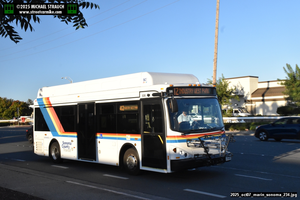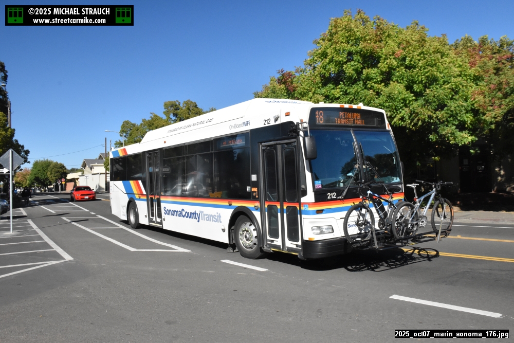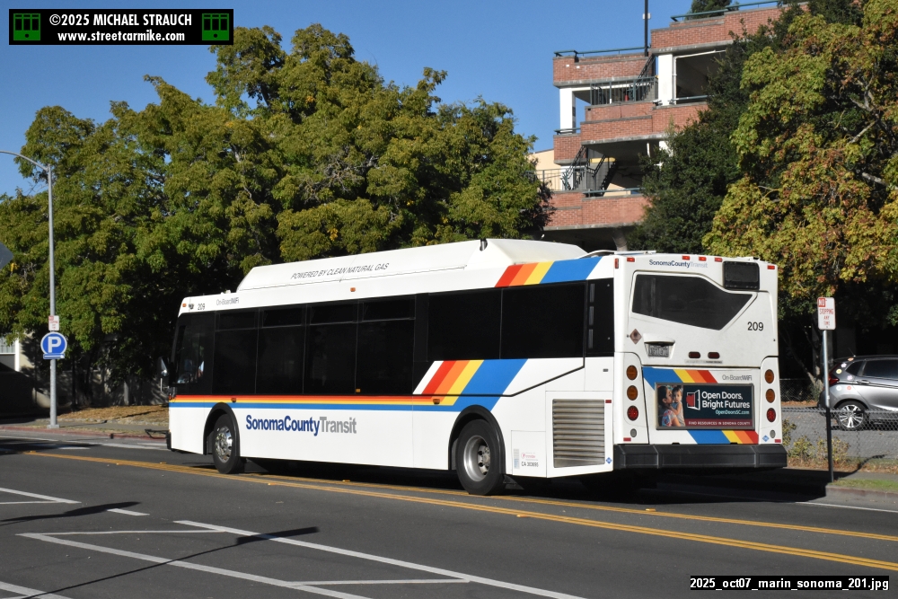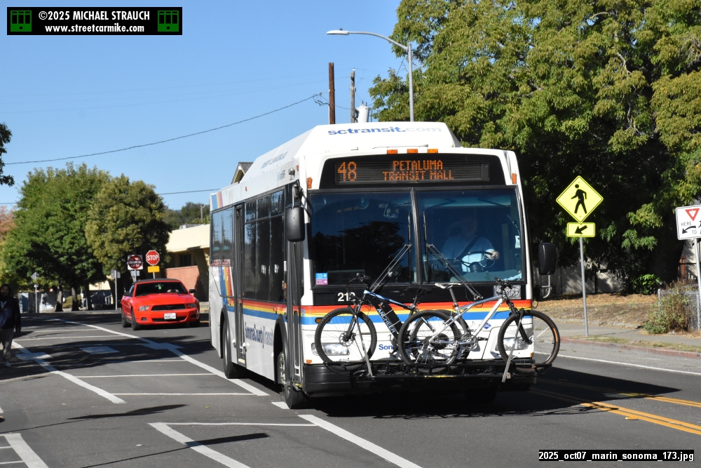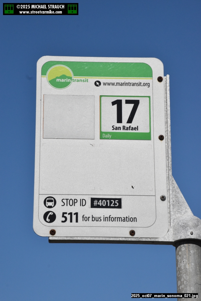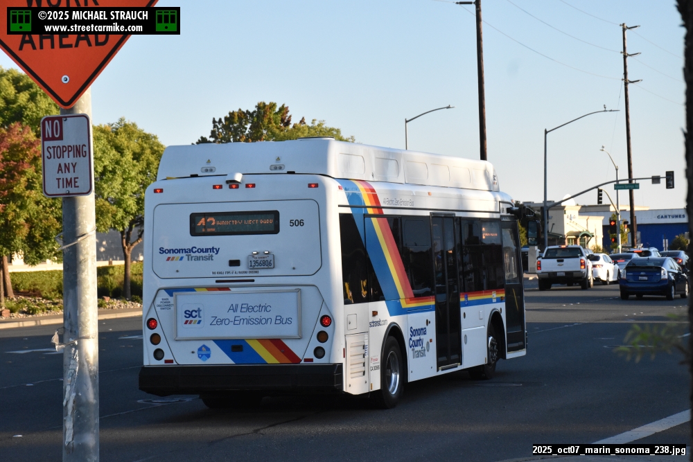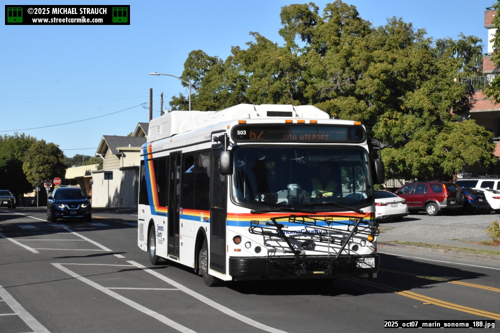 A drive up to Sonoma County begins with a stop in Marin City near the transit hub for Marin Transit and Golden Gate Transit buses. Then it's on to Petaluma, where I photographed a southbound SMART train behind the Lucky Supermarket on Petaluma Blvd. Drove on up to Santa Rosa and parked near Junior College to get pictures of buses on Mendocino Blvd., both Santa Rosa CityBus and Sonoma County Transit.