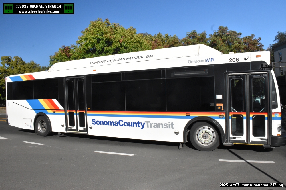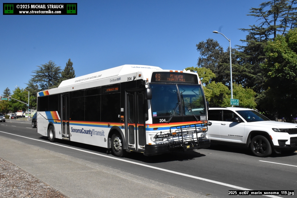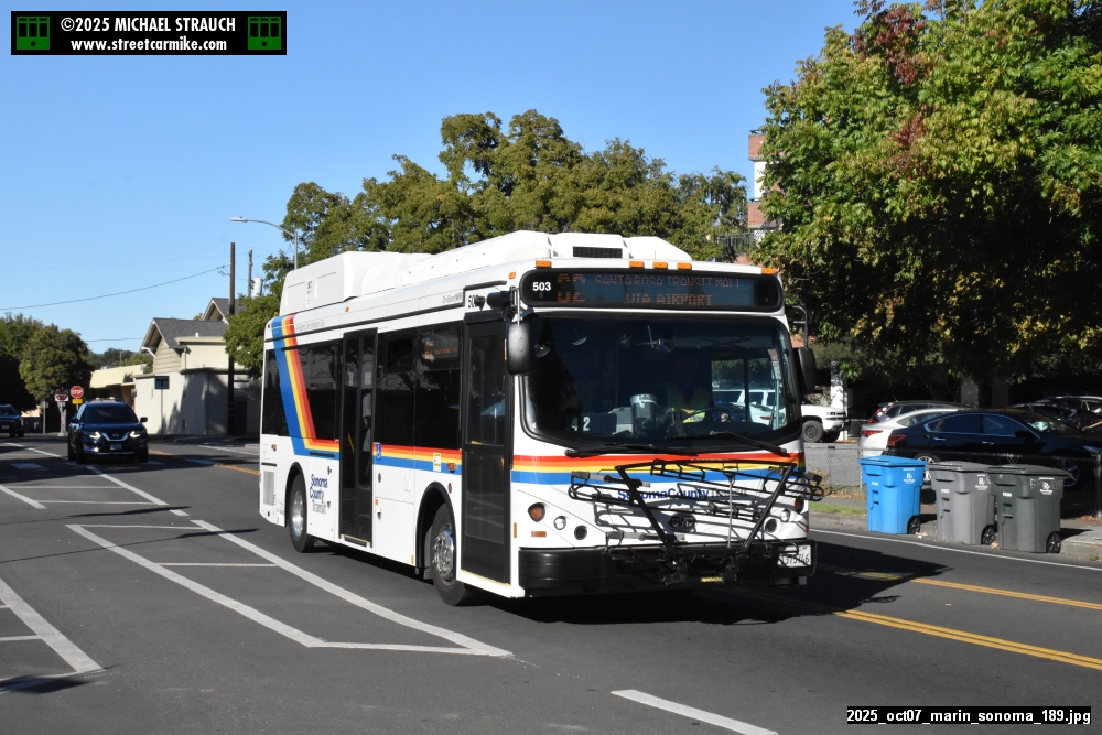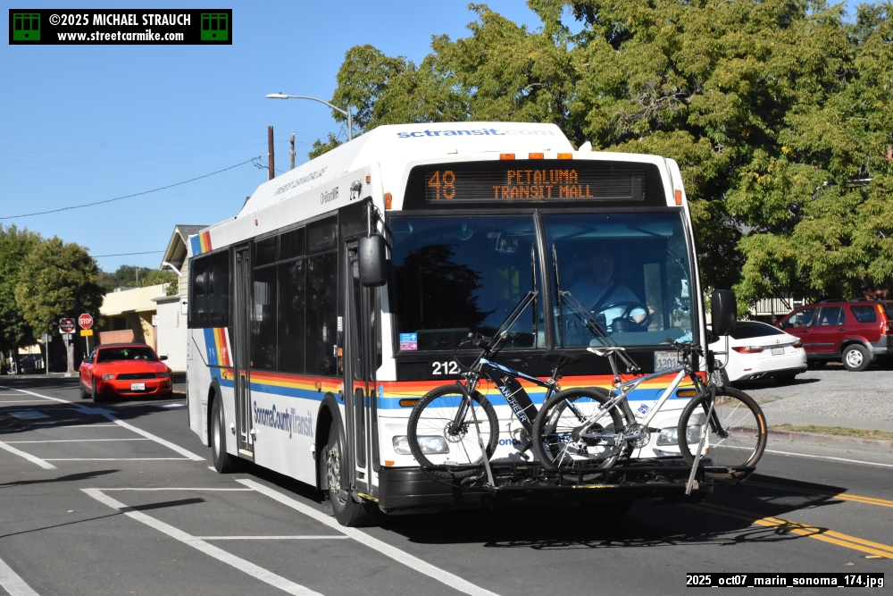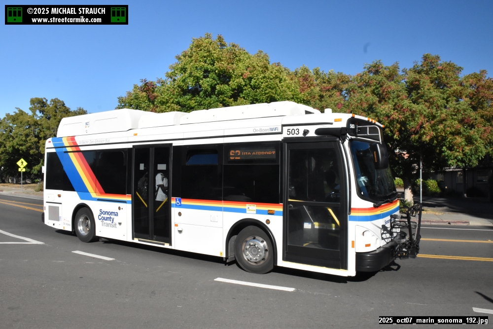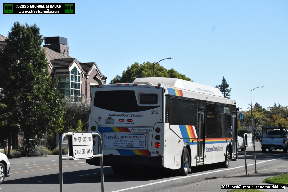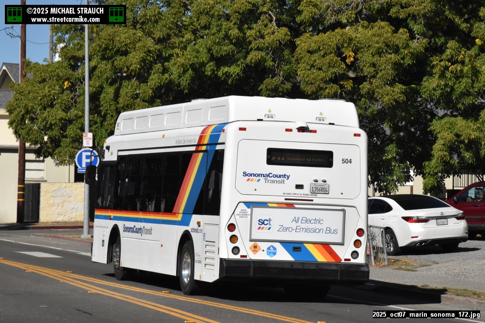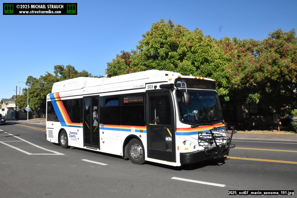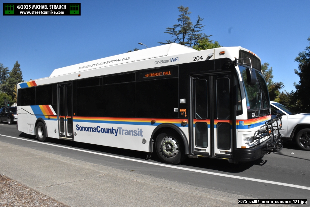 A drive up to Sonoma County begins with a stop in Marin City near the transit hub for Marin Transit and Golden Gate Transit buses. Then it's on to Petaluma, where I photographed a southbound SMART train behind the Lucky Supermarket on Petaluma Blvd. Drove on up to Santa Rosa and parked near Junior College to get pictures of buses on Mendocino Blvd., both Santa Rosa CityBus and Sonoma County Transit.