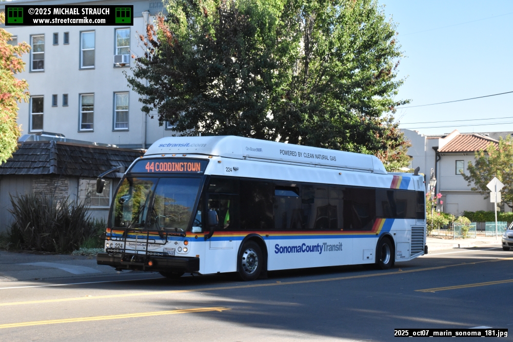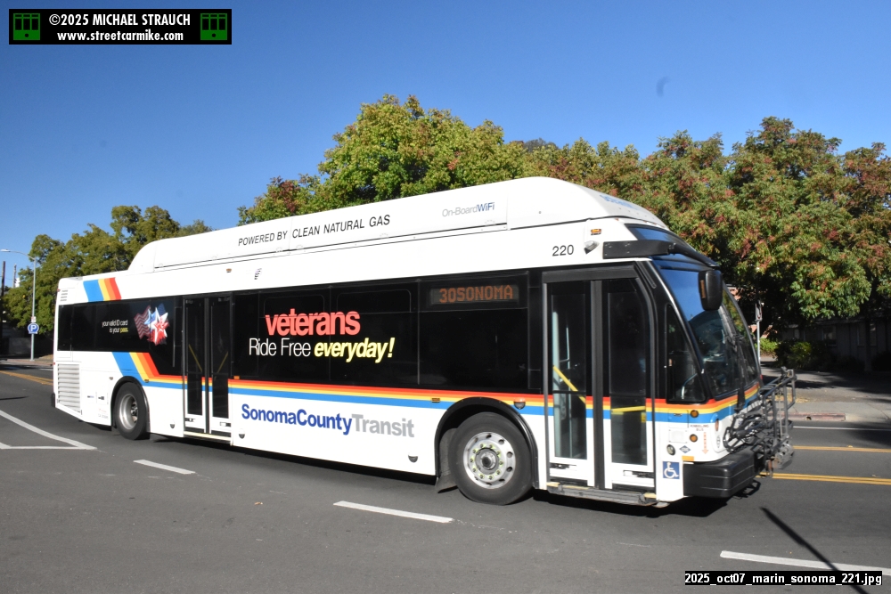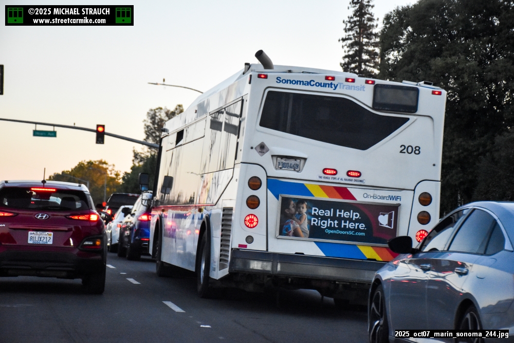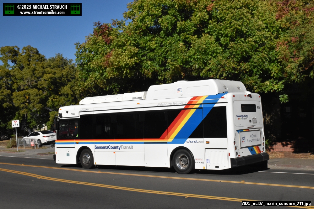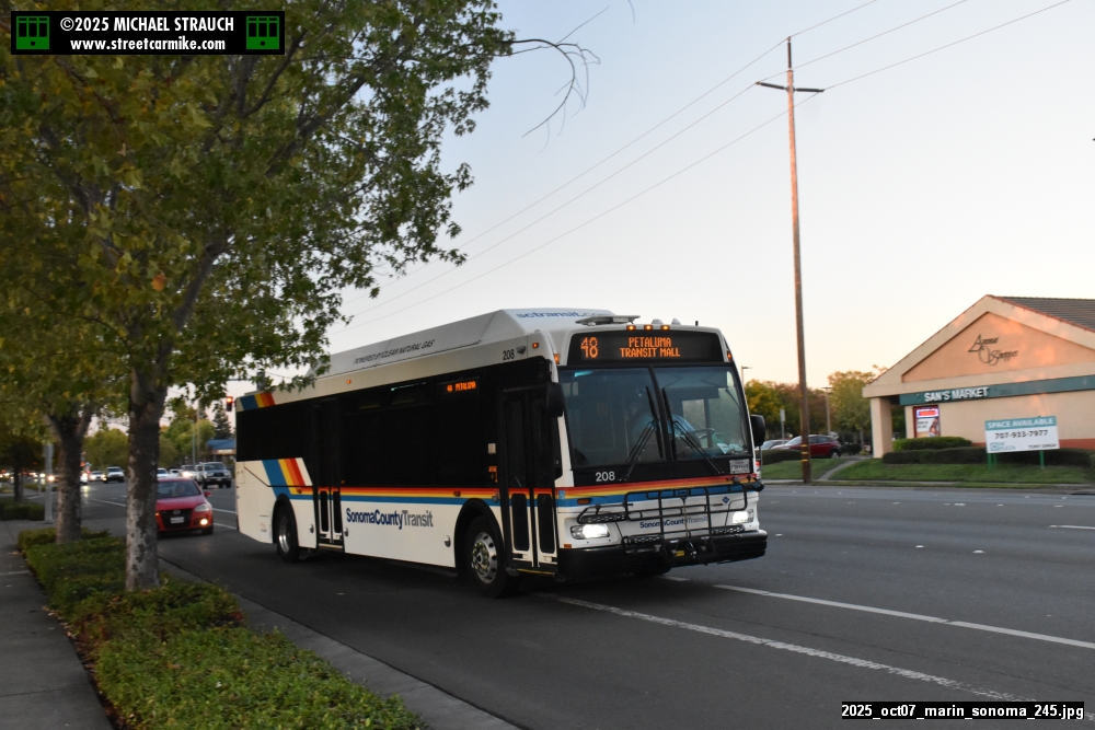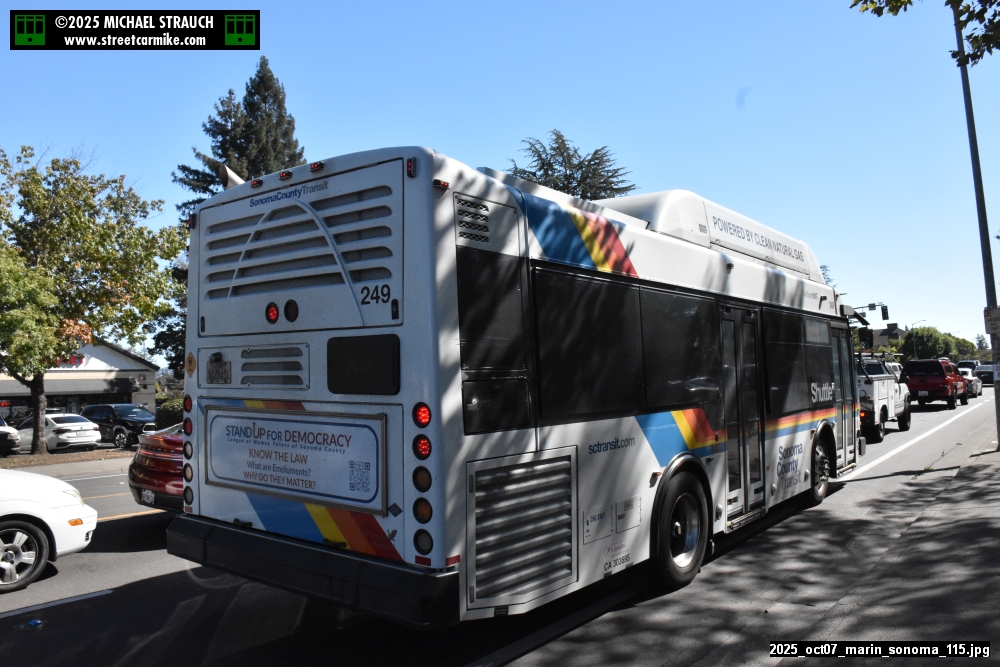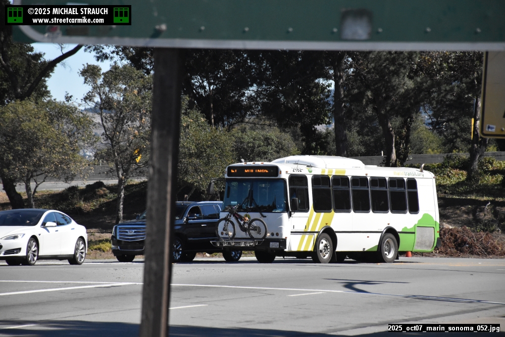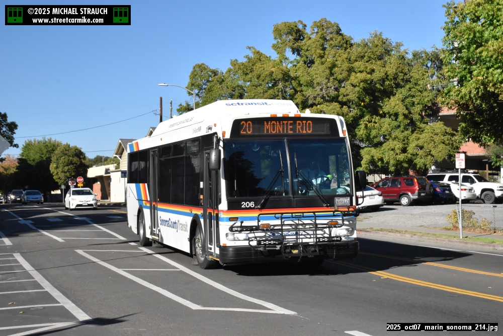 A drive up to Sonoma County begins with a stop in Marin City near the transit hub for Marin Transit and Golden Gate Transit buses. Then it's on to Petaluma, where I photographed a southbound SMART train behind the Lucky Supermarket on Petaluma Blvd. Drove on up to Santa Rosa and parked near Junior College to get pictures of buses on Mendocino Blvd., both Santa Rosa CityBus and Sonoma County Transit.