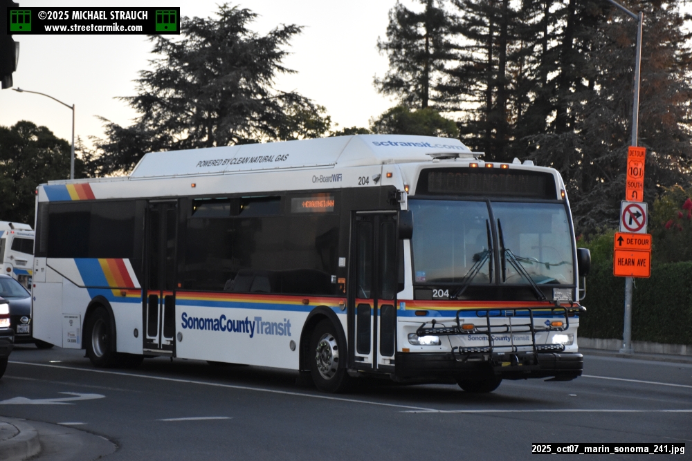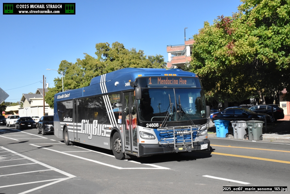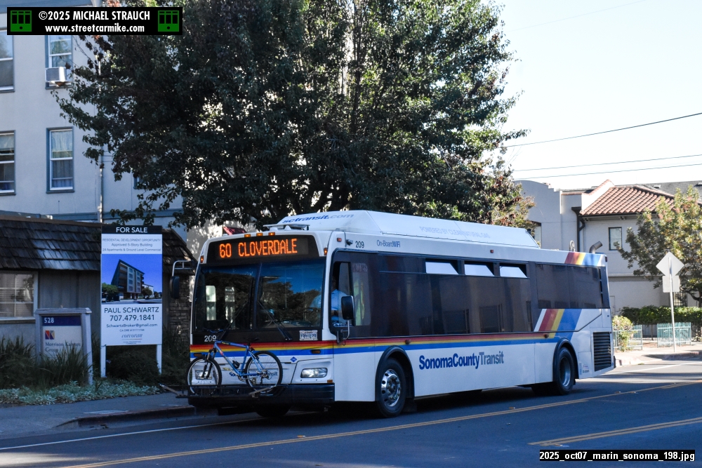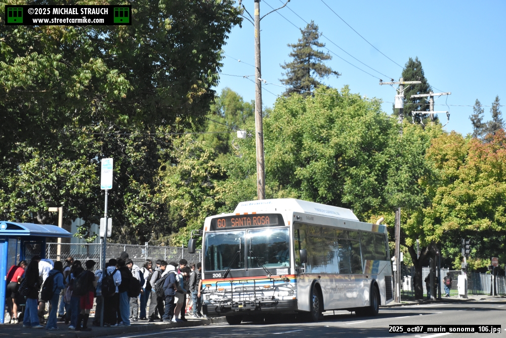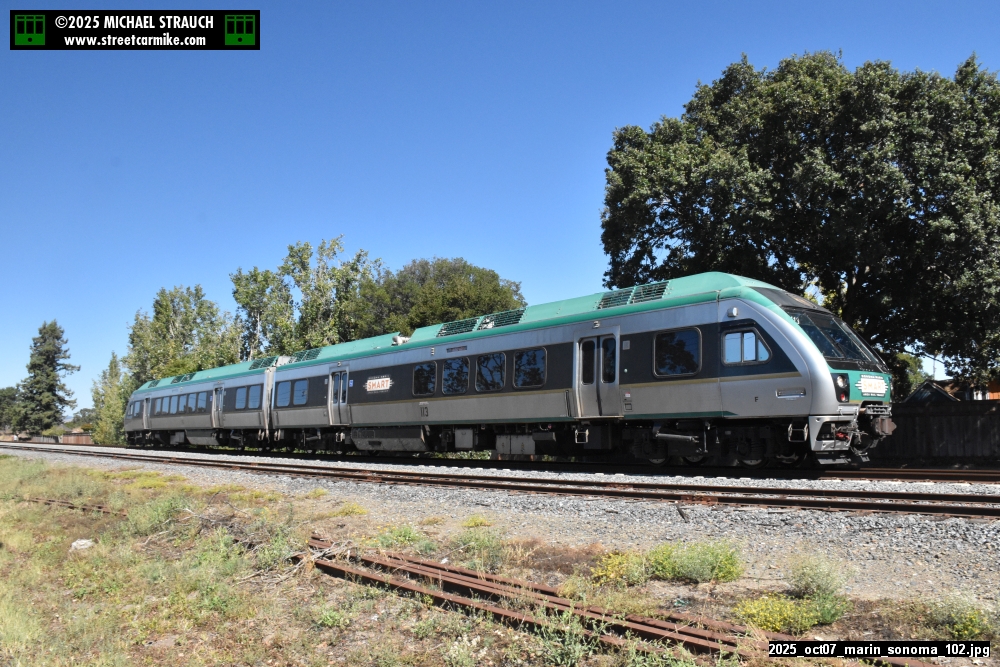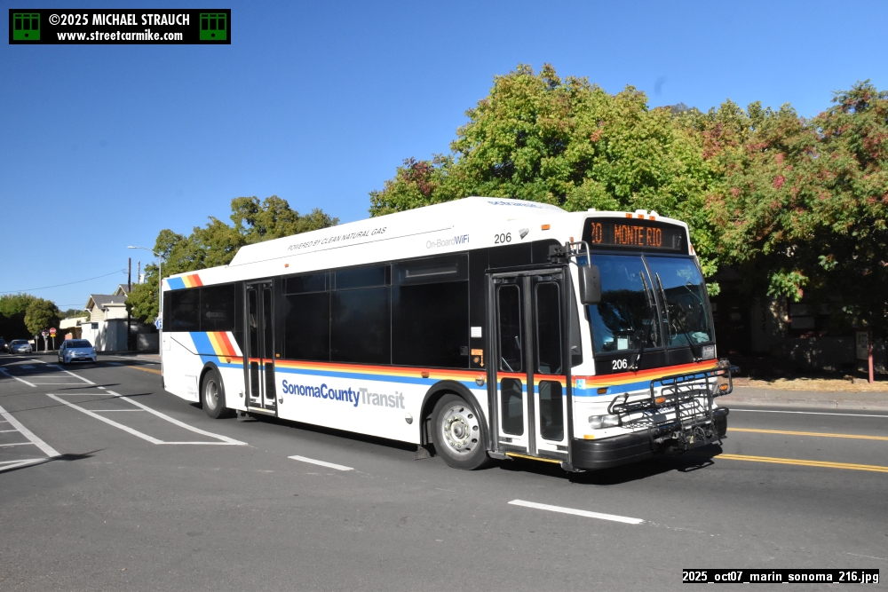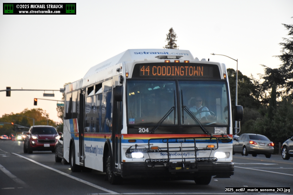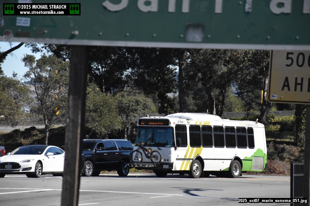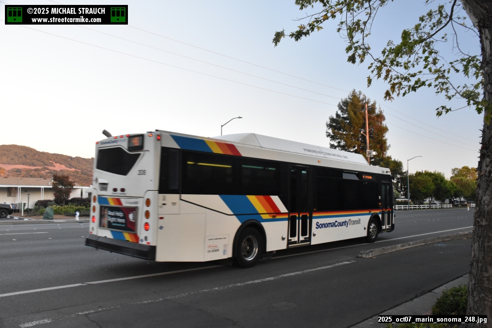 A drive up to Sonoma County begins with a stop in Marin City near the transit hub for Marin Transit and Golden Gate Transit buses. Then it's on to Petaluma, where I photographed a southbound SMART train behind the Lucky Supermarket on Petaluma Blvd. Drove on up to Santa Rosa and parked near Junior College to get pictures of buses on Mendocino Blvd., both Santa Rosa CityBus and Sonoma County Transit.