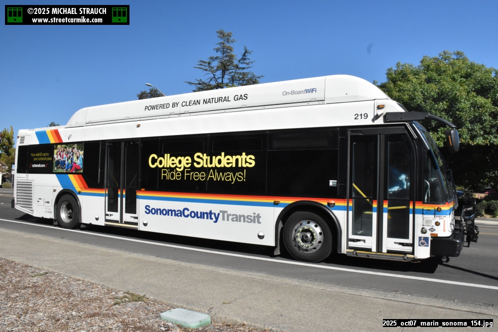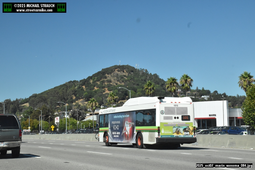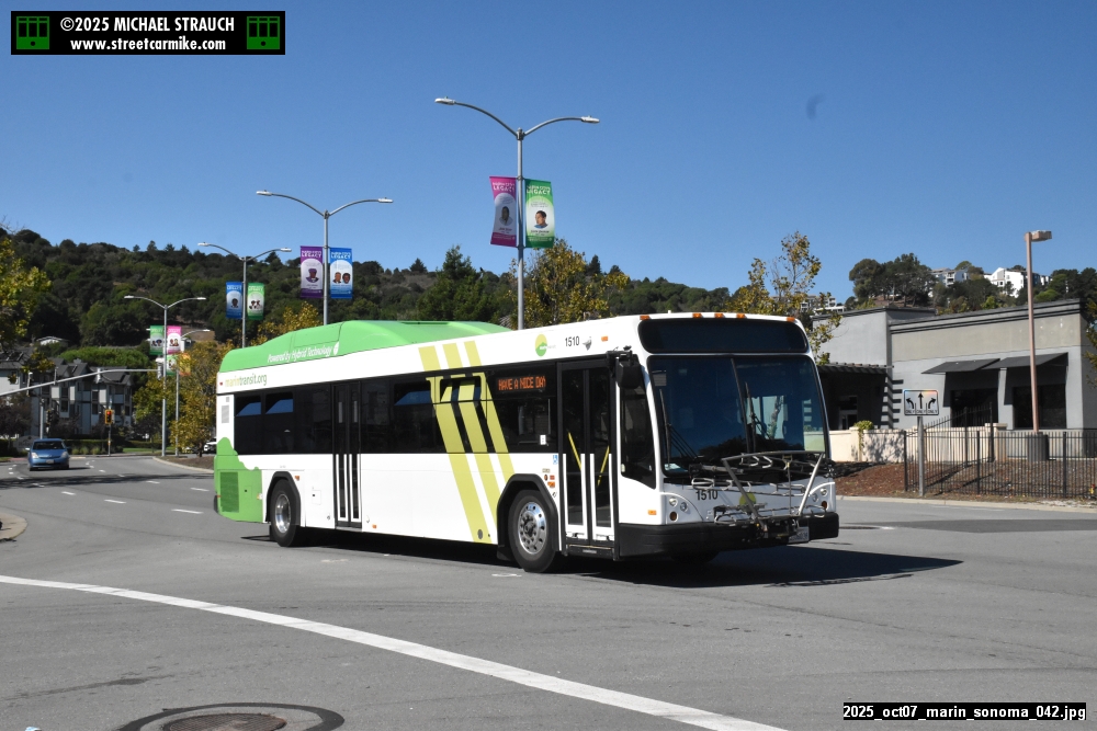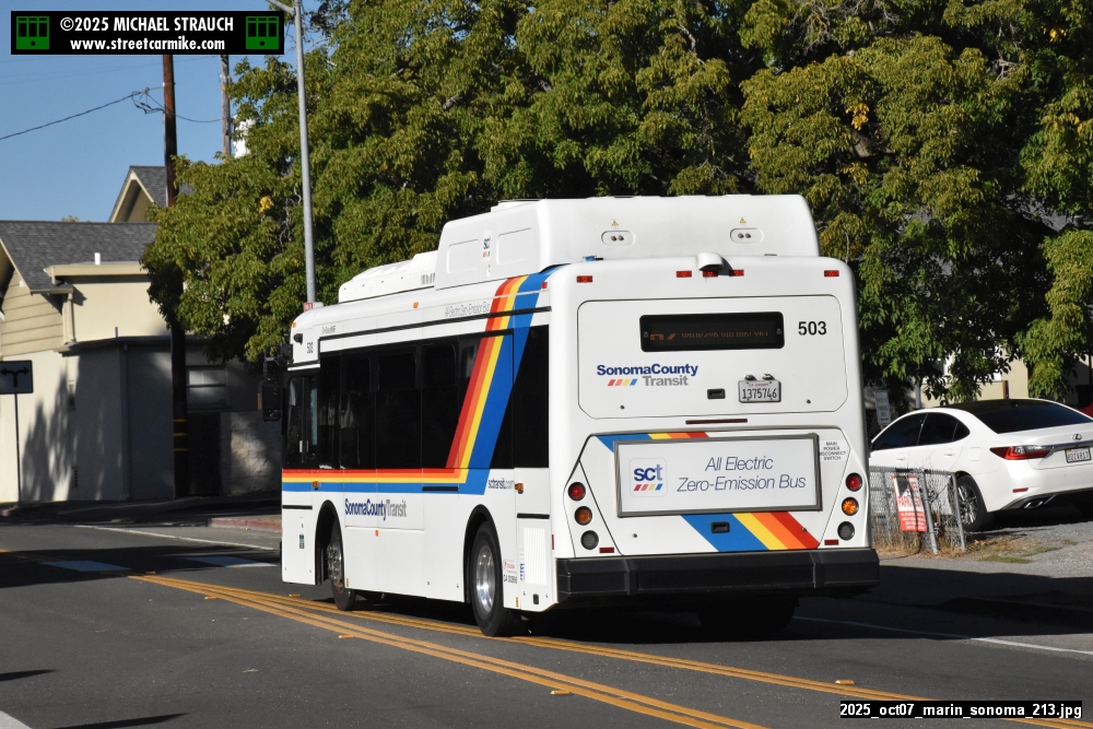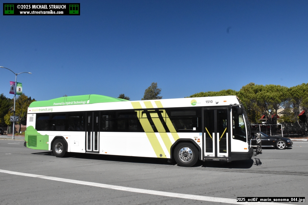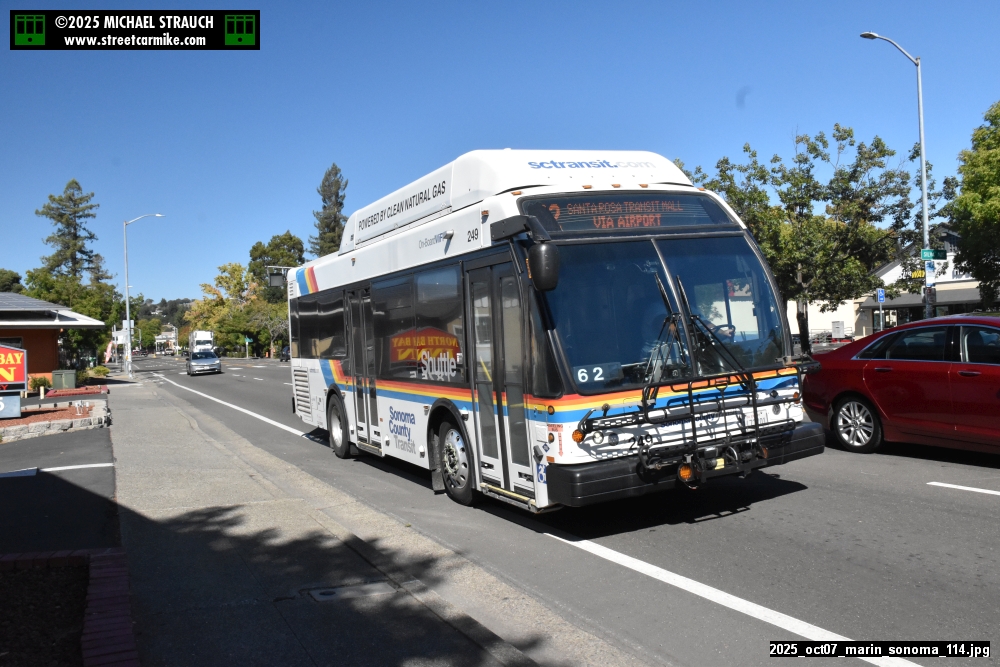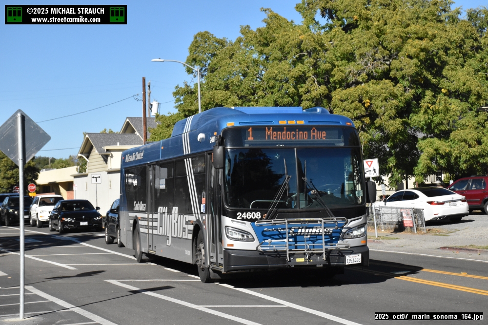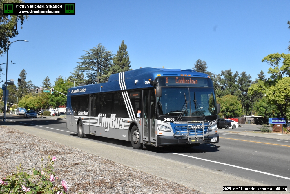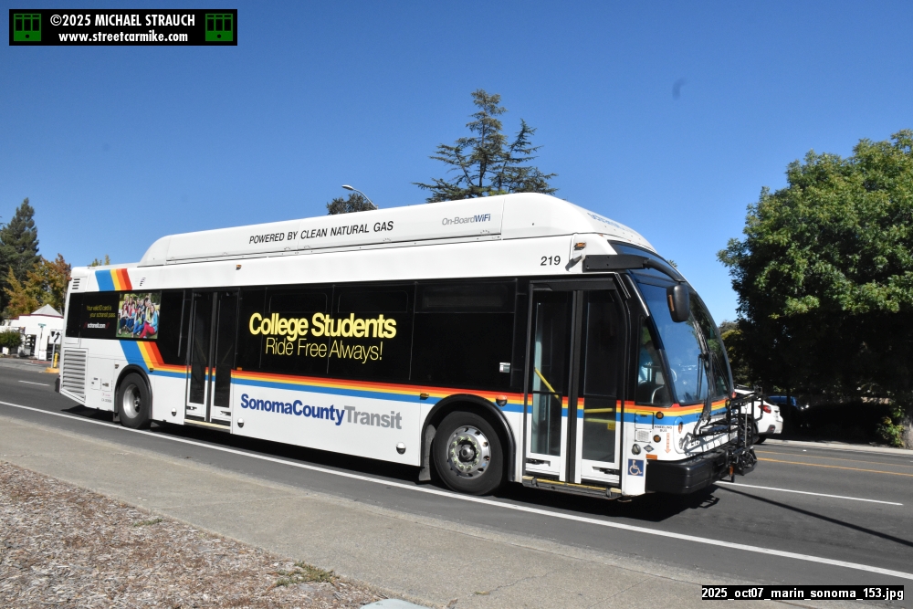 A drive up to Sonoma County begins with a stop in Marin City near the transit hub for Marin Transit and Golden Gate Transit buses. Then it's on to Petaluma, where I photographed a southbound SMART train behind the Lucky Supermarket on Petaluma Blvd. Drove on up to Santa Rosa and parked near Junior College to get pictures of buses on Mendocino Blvd., both Santa Rosa CityBus and Sonoma County Transit.