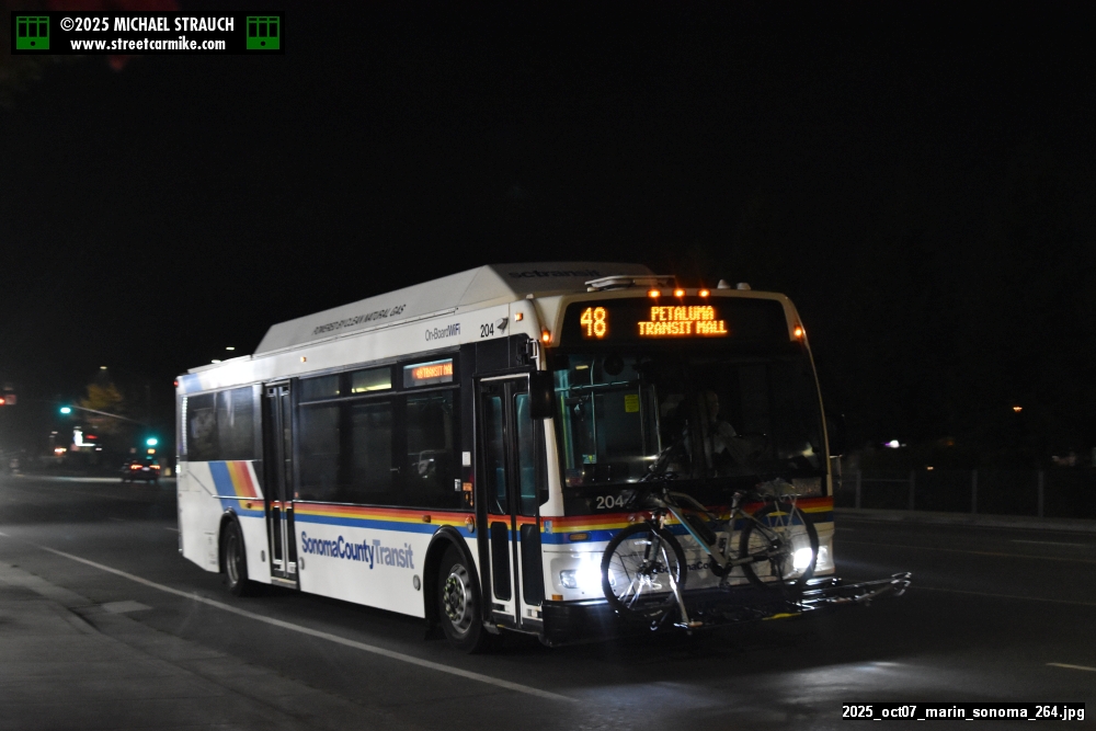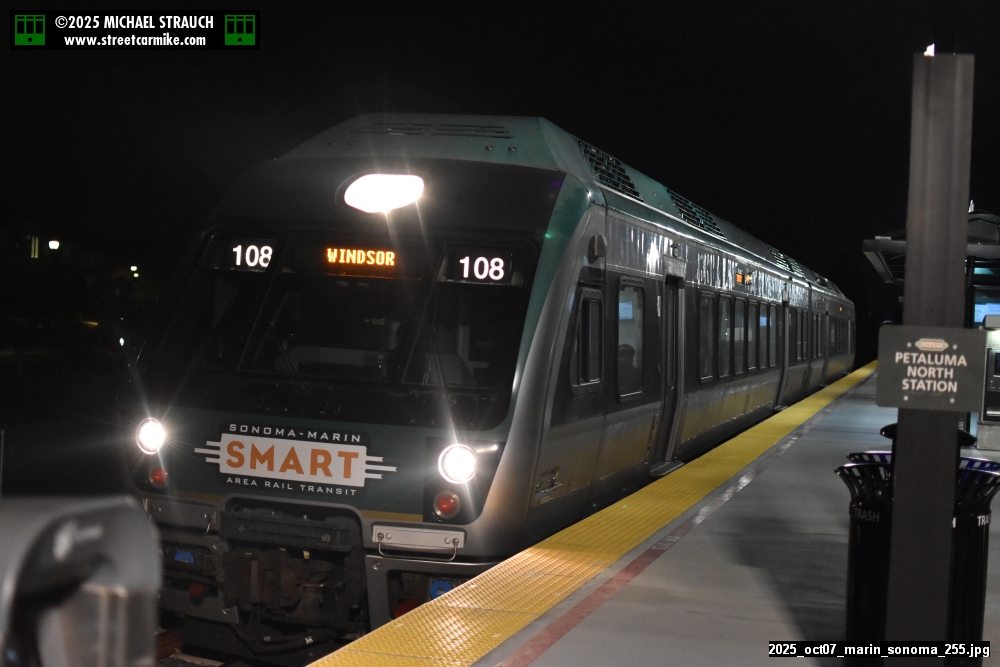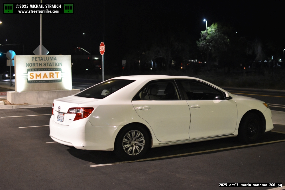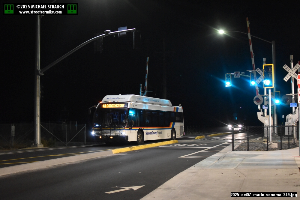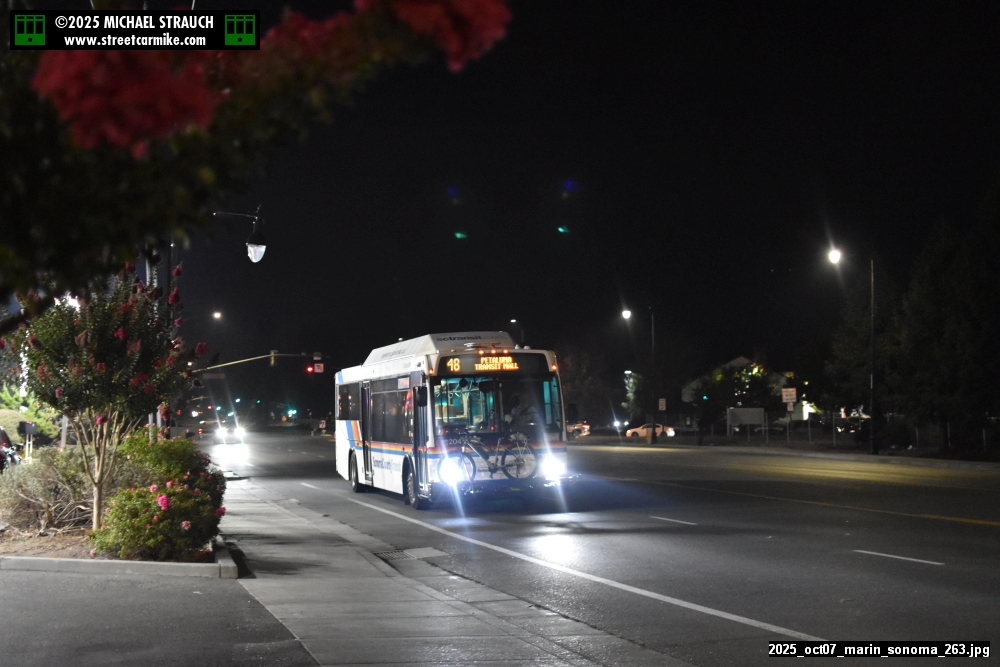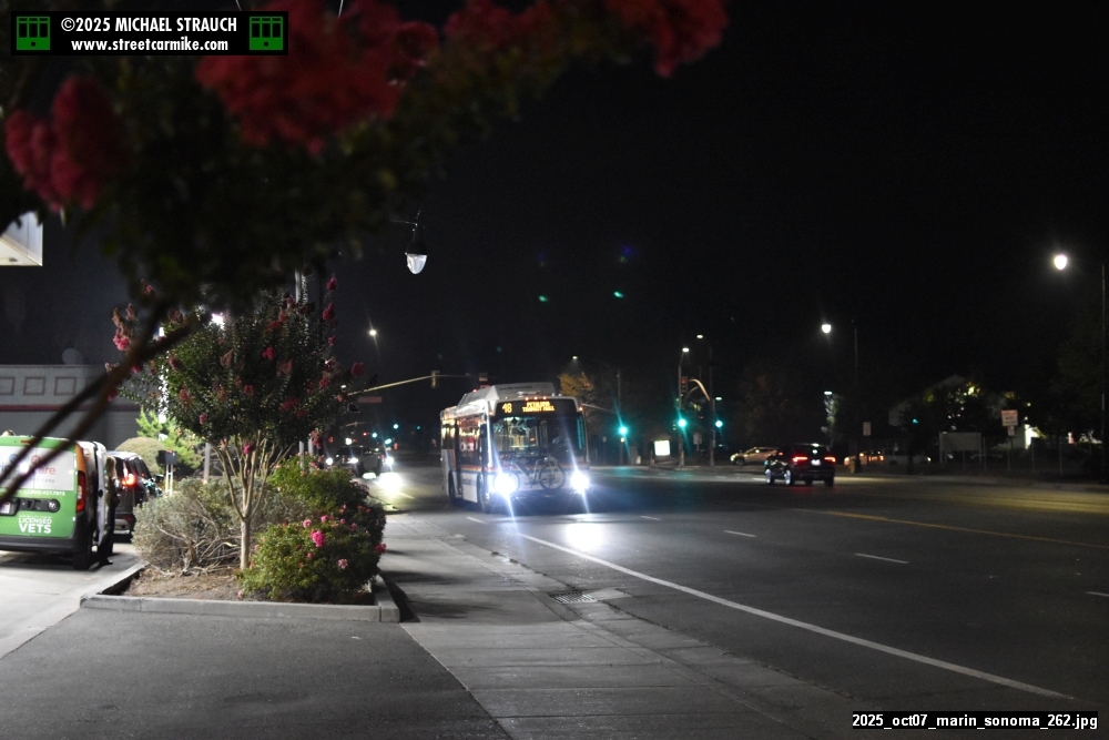Did a few fading sun shots on Santa Rosa Ave. in the south part of the city. Concluded after dinner by taking photos of a SMART train at night at North Petaluma Station, then getting a southbound 48 bus on Old Redwood Hwy. before it reached the 101. A brightly lighted gas station allowed that to happen.