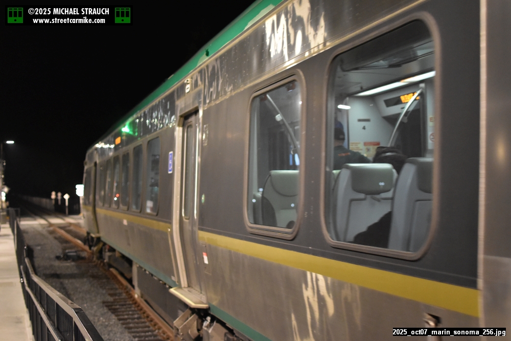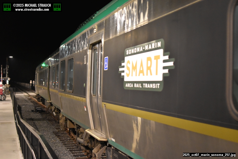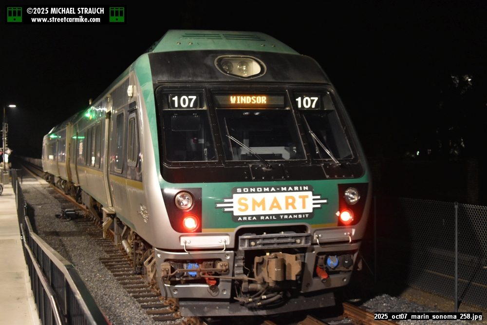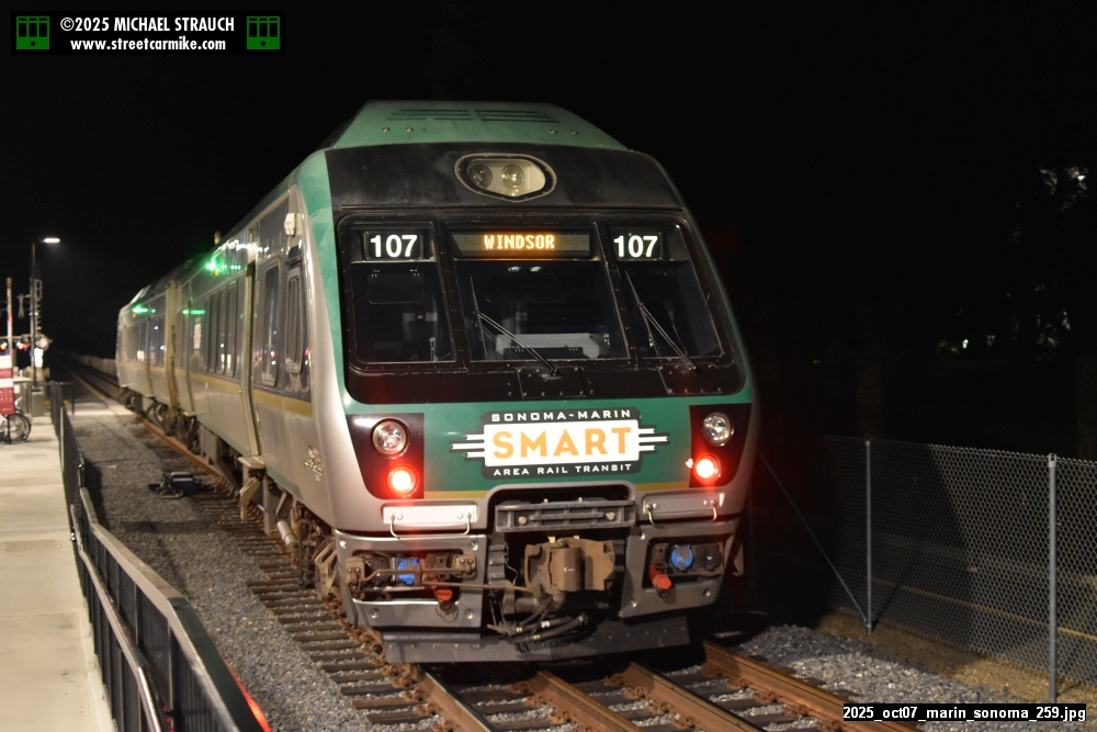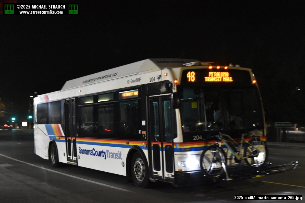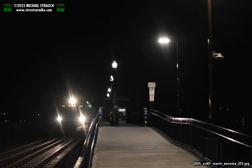 Did a few fading sun shots on Santa Rosa Ave. in the south part of the city. Concluded after dinner by taking photos of a SMART train at night at North Petaluma Station, then getting a southbound 48 bus on Old Redwood Hwy. before it reached the 101. A brightly lighted gas station allowed that to happen.