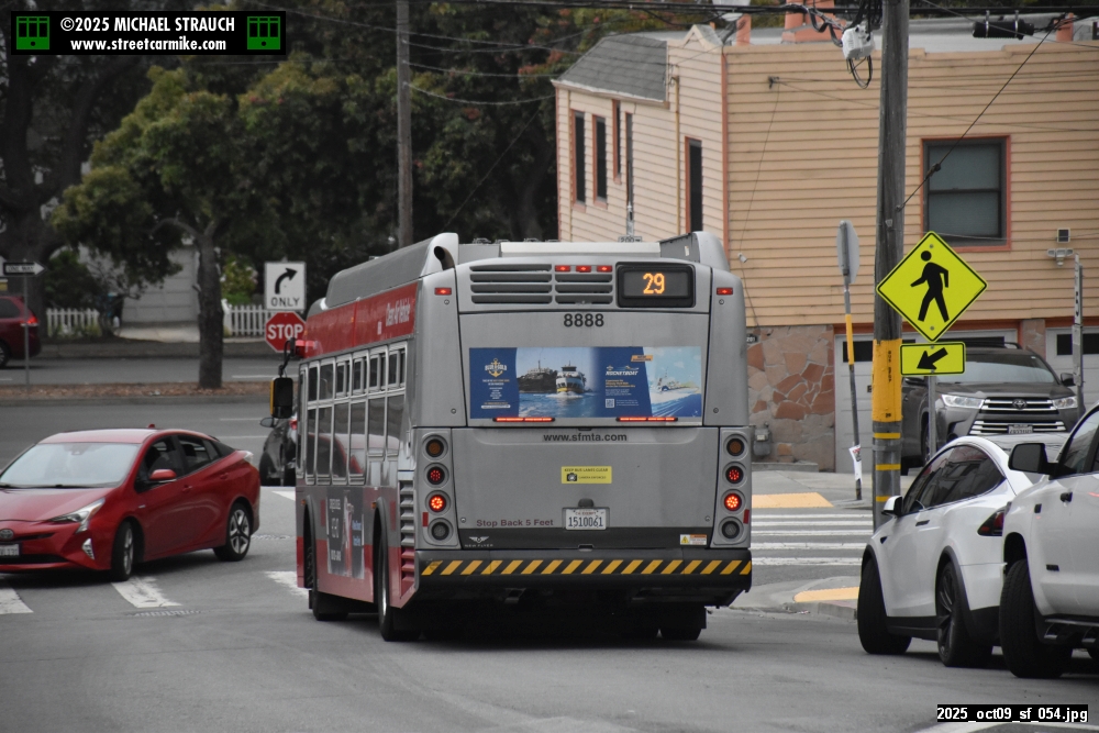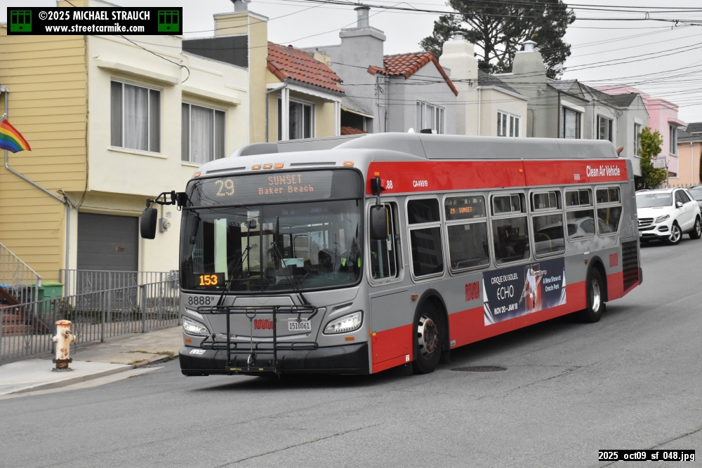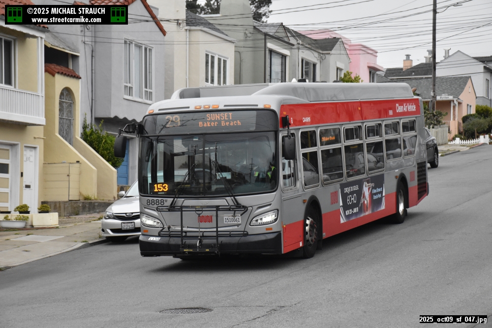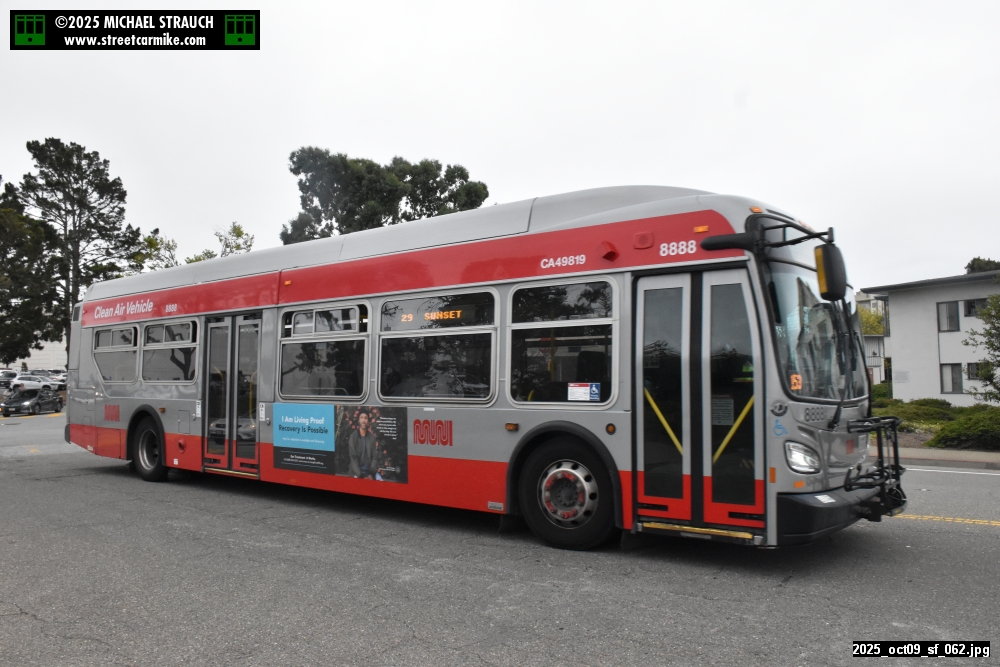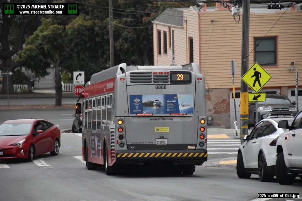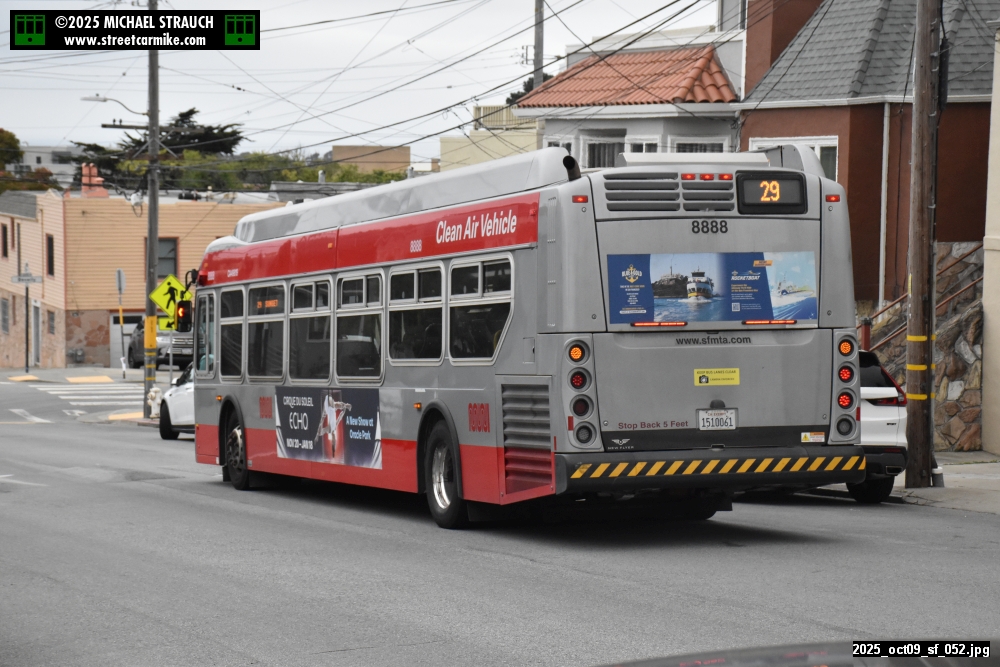 Stopped by the Ocean View Laundromat on 19th Ave. in San Francisco. As the dryer started, I drove to the 29 Sunset line on Garfield St. and then on Winston Ave. to get more shots of New Flyer 8888.